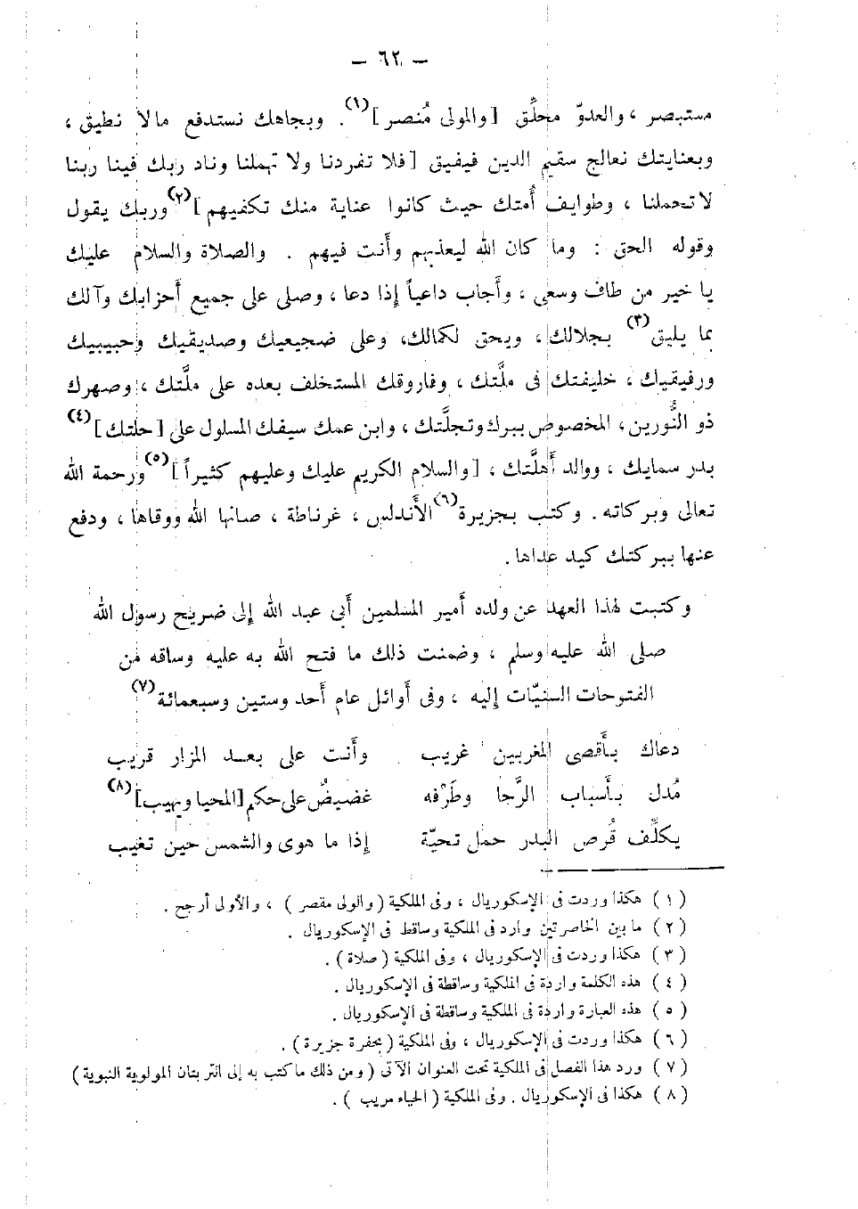 مستبصر، والعدو محلق [وَالْمولى منصر] . وبجاهك نستدفع مَا لَا نطيق، وبعنايتك نعالج سقيم الدّين فيفيق [فَلَا تفردنا وَلَا تهملنا وناد رَبك فِينَا رَبنَا لَا تحملنا، وطوايف أمتك حَيْثُ كَانُوا عناية مِنْك تكفيهم] وَرَبك يَقُول وَقَوله الْحق: وَمَا كَانَ الله ليعذبهم وَأَنت فيهم. وَالصَّلَاة وَالسَّلَام عَلَيْك يَا خير من طَاف وسعى، وَأجَاب دَاعيا إِذا دَعَا، وَصلى على جَمِيع آحزابك وآلك بِمَا يَلِيق بجلالك ويحق لكمالك، وعَلى ضجيعيك وصديقيك وحبيبيك ورفيقيك، خلفيتك فِي ملتك، وفاروقك الْمُسْتَخْلف بعده على ملتك، وصهرك ذُو النورين، الْمَخْصُوص ببرك وتجلتك، وَابْن عمك سَيْفك المسلول على [حلتك] بدر سمايك، ووالد أهلتك، [وَالسَّلَام الْكَرِيم عَلَيْك وَعَلَيْهِم كثيرا] وَرَحْمَة الله تَعَالَى وَبَرَكَاته. وَكتب بِجَزِيرَة الأندلس، غرناطة، صانها الله ووقاها، وَدفع عَنْهَا ببركتك كيد عَداهَا.