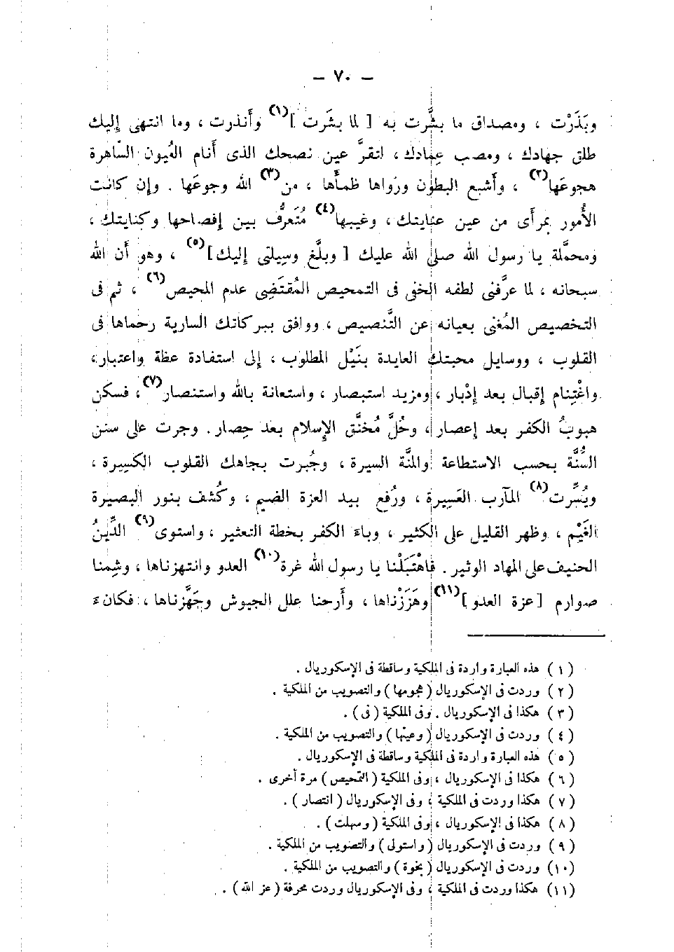 وبذرت، ومصداق مَا بشرت بِهِ [لما بشرت] وأنذرت، وَمَا انْتهى إِلَيْك طلق جهادك، ومصب عمادك، لتقر عين نصحك الَّذِي أَنَام الْعُيُون الساهرة هجوعها، وَأَشْبع الْبُطُون وَرَوَاهَا ظمأها، من الله وجوعها. وَإِن كَانَت الْأُمُور بمرأى من عين عنايتك، وغيبها متعرف بَين إفصاحها وكنايتك، ومحملة يَا رَسُول الله صلى الله عَلَيْك] وَبلغ وسيلتي إِلَيْك] ، وَهُوَ أَن الله سُبْحَانَهُ، لما عرفني لطفه الْخَفي فِي التمحيص الْمُقْتَضى عدم المحيص، ثمَّ فِي التَّخْصِيص المغنى بعيانه عَن التَّنْصِيص، وَوَافَقَ ببركاتك السارية رحماها فِي الْقُلُوب، ووسايل محبتك العايدة بنيل الْمَطْلُوب، إِلَى استفادة عظة وَاعْتِبَار، واغتنام إقبال بعد إدبار، ومزيد استبصار، واستعانة بِاللَّه واستنصار، فسكن هبوب الْكفْر بعد إعصار، وَحل مخنق الْإِسْلَام بعد حِصَار. وَجَرت على سنَن السّنة بِحَسب الِاسْتِطَاعَة والْمنَّة السِّيرَة، وجبرت بجاهك الْقُلُوب الكسيرة، ويسرت المآرب العسيرة، وَرفع بيد الْعِزَّة الضيم، وكشف بِنور البصيرة الْغَيْم، وَظهر الْقَلِيل على الْكثير، وباء الْكفْر بخطة التعثير، واستوى الدّين الحنيف على المهاد الوثير. فاهتبلنا يَا رَسُول الله غرَّة الْعَدو وانتهزناها، وشمنا صوارم [عزة الْعَدو] وهززناها، وَأَرِحْنَا علل الجيوش وجهزناها، فكانء