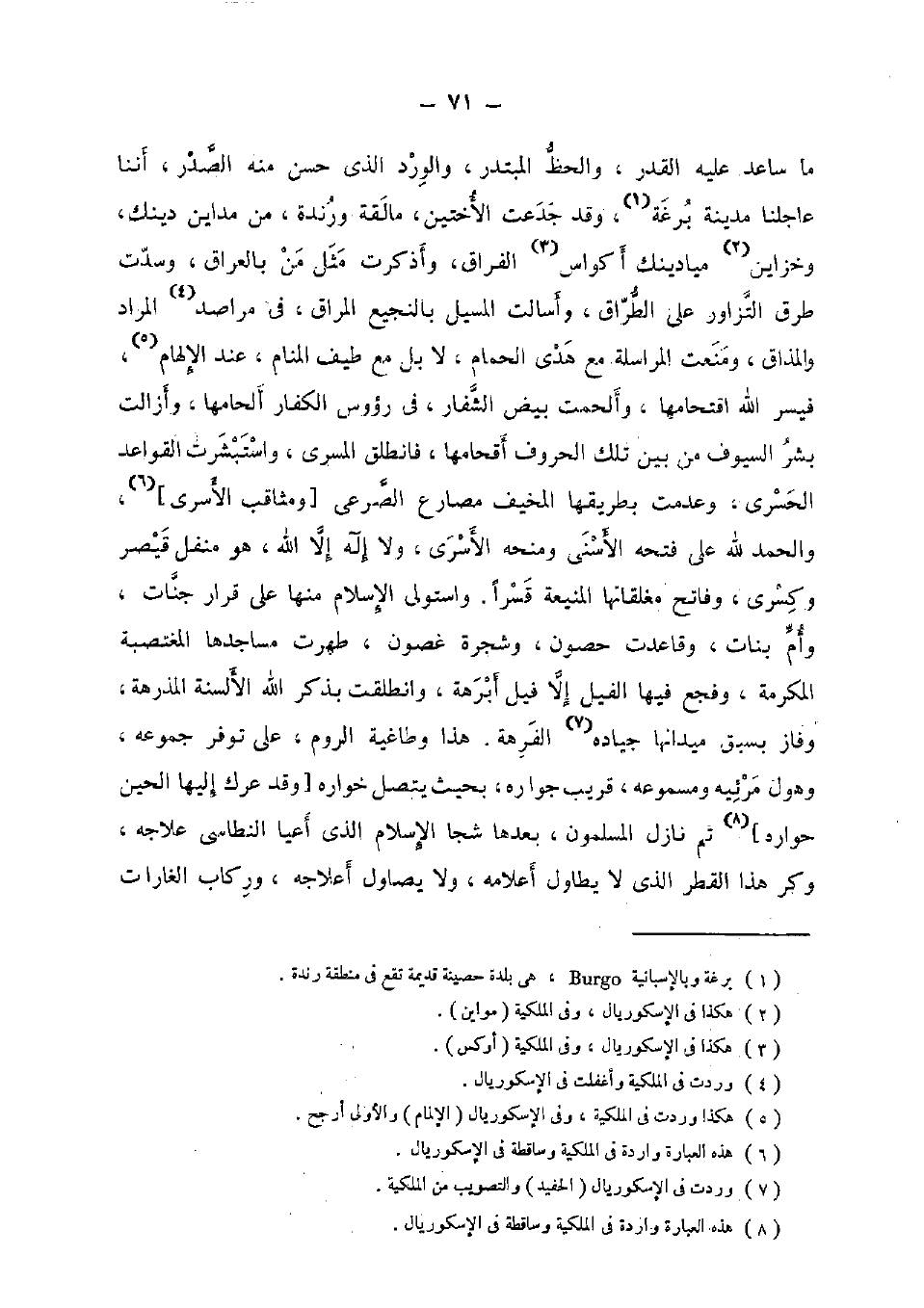 مَا ساعد عَلَيْهِ الْقدر، والحظ المبتدر، والورد الَّذِي حسن مِنْهُ الصَّدْر، أننا عاجلنا مَدِينَة برغة، وَقد جدعت الْأُخْتَيْنِ، مالقة ورندة، من مداين دينك، وخزاين ميادينك أكواس الْفِرَاق، وأذكرت مثل من بالعراق، وسدت طرق التزاور على الطراق، وأسالت المسيل بالنجيع المراق، فِي مراصد المُرَاد والمذاق، ومنعت المراسلة مَعَ هدى الْحمام، لَا بل مَعَ طيف الْمَنَام، عِنْد الإلهام، فيسر الله اقتحامها، وألحمت بيض الشفار، فِي رُؤُوس الْكفَّار ألحامها، وأزالت بشر السيوف من بَين تِلْكَ الْحُرُوف أقحامها، فَانْطَلق المسرى، واستبشرت الْقَوَاعِد الحسرى، وعدمت طريقها المخيف مصَارِع الصرعى [ومثاقب الأسرى] ، وَالْحَمْد لله على فَتحه الْأَسْنَى ومنحه الأسرى، وَلَا إِلَه إِلَّا الله، هُوَ منفل قَيْصر وكسرى، وفاتح مغلقاتها المنيعة قسرا، وَاسْتولى الْإِسْلَام مِنْهَا على قَرَار جنَّات، وَأم بَنَات، وقاعدت حصون، وشجرة غصون، طهرت مساجدها المغتصبة المكرمة، وفجع فِيهَا الْفِيل إِلَّا فيل أَبْرَهَة، وَانْطَلَقت بِذكر الله أَلْسِنَة المذرهة، وفاز بسبق ميدانها جياده الفرهة، هَذَا وطاغية الرّوم، على توفر جموعه، وهول مرئيه ومسموعه، قريب جواره، بِحَيْثُ يتَّصل خواره [وَقد عَرك إِلَيْهَا الْحِين حواره] ثمَّ نَازل الْمُسلمُونَ، بعْدهَا شجا الْإِسْلَام الَّذِي أعيا النطاسي علاجه، وكر هَذَا الْقطر الَّذِي لَا يطاول أَعْلَامه، وَلَا يصاول أعلاجه، وركاب الغارات