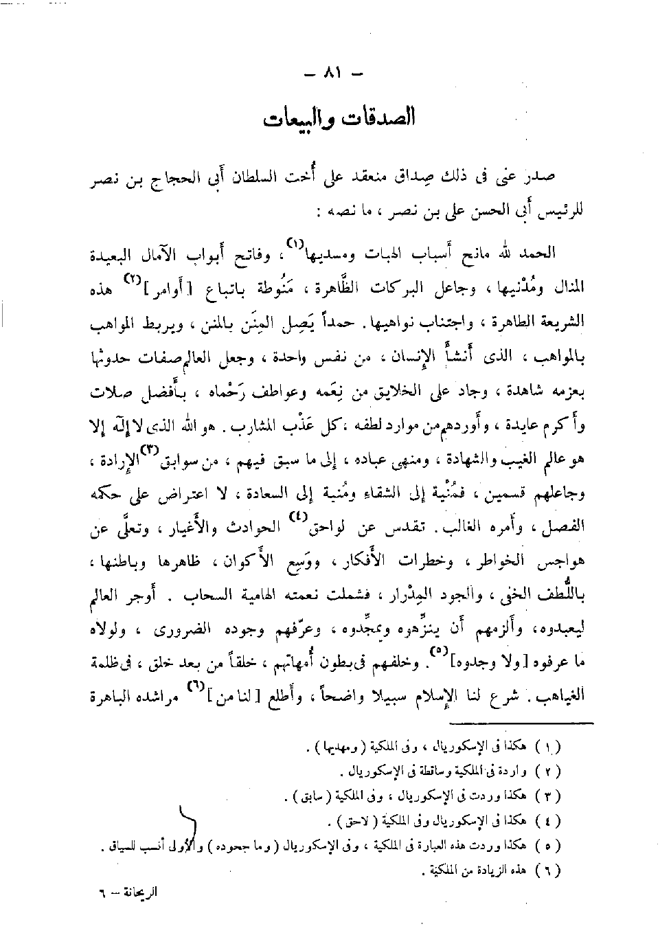 الْحَمد لله مانح أَسبَاب الهبات ومسديها، وفاتح أَبْوَاب الآمال الْبَعِيدَة المنال ومدنيها، وجاعل البركات الظَّاهِرَة، منوطة بِاتِّبَاع [أوَامِر] هَذِه الشَّرِيعَة الطاهرة، وَاجْتنَاب نواهيها. حمدا يصل المنن بالمنن، ويربط الْمَوَاهِب بالمواهب، الَّذِي أنشأ الْإِنْسَان، من نفس وَاحِدَة، وَجعل الْعَالم صِفَات حدوثها بعرمه شاهدة، وجاد على الخلايق من نعمه وعواطف رحماه، بِأَفْضَل صلات وَأكْرم عايدة، وأوردهم من موارد لطفه، كل عذب المشارب. هُوَ الله الَّذِي لَا إِلَه إِلَّا هُوَ عَالم الْغَيْب وَالشَّهَادَة، ومنهى عباده، إِلَى مَا سبق فيهم. من سوابق الْإِرَادَة، وجاعلهم قسمَيْنِ، فمنية إِلَى الشَّقَاء ومنية إِلَى السَّعَادَة، لَا اعْتِرَاض على حكمه الْفَصْل، وَأمره الْغَالِب. تقدس عَن لواحق الْحَوَادِث والأغيار، وتعلى عَن هواجس الخواطر، وخطرات الأفكار، ووسع الأكوان، ظَاهرهَا وباطنها، باللطف الْخَفي، والجود المدرار، فشملت نعْمَته الهامية السَّحَاب. أوجر الْعَالم ليعبدوه، وألزمهم أَن ينزهوه ويمجدوه، وعرفهم وجوده الضَّرُورِيّ، ولولاه مَا عرفوه [وَلَا وجدوه] . وخلفهم فِي بطُون أمهاتهم، خلقا من بعد خلق، فِي ظلمَة الغياهب. شرع لنا الْإِسْلَام سَبِيلا وَاضحا، وأطلع [لنا من]] مراشده الباهرة