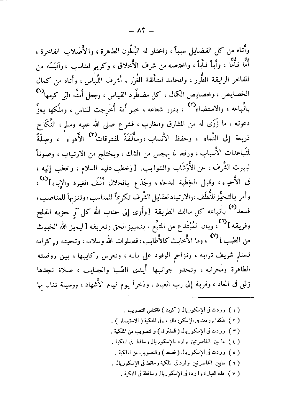 وَأَتَاهُ من كل الفضايل سَببا، وَاخْتَارَ لَهُ الْبُطُون الطاهرة، والأصلاب الفاخرة، أما فَأَما، وَأَبا فأبا، واختصه من شرف الْأَخْلَاق، وكريم الْمُنَاسب، وَألبسهُ من المفاخر الرايقة الطرر، والمحامد المتألقة الْغرَر، أشرف اللبَاس، وَأَتَاهُ من كَمَال والخصايص، وخصايص الْكَمَال، كل مضطرد الْقيَاس، وَجعل أمته الَّتِي كرمها باتباعه، والاستضاء، بِنور شعاعه، خير أمة أخرجت للنَّاس، وملكها بعز دَعوته، مَا زوى لَهُ من الْمَشَارِق والمغارب، فشرع صلى الله عَلَيْهِ وَسلم، النِّكَاح ذَرِيعَة إِلَى النَّمَاء، وَحفظ الْأَنْسَاب، ومألفة لمفترقات الْأَهْوَاء، وصلَة لمتباعدات الْأَسْبَاب، ورفعها لما يهجس من الشَّك، ويختلج من الأرتياب، وصونا لبيوت الشّرف، عَن الأوشاب والشوايب. [وخطب عَلَيْهِ السَّلَام، وخطب إِلَيْهِ، فِي الْأَحْيَاء، وَقبل الْخطْبَة للدُّعَاء، وجدع بالحلال أنف الْغيرَة والأباء] ، وَأمر بالتحيز للنطف، والارتياد لعقايل الشّرف تكريما للمناسب، وتنزيها للمناصب، فسعد باتباعه كل سالك الطَّرِيقَة [وَأَوَى إِلَى جناب الله كل آو لحزبه المفلح وفريقه] ، وَبَان المبتدع من المتبع، بتمييز الْحق وتعريفه [ليميز الله الْخَبيث من الطّيب] ، وَمَا الأخابث كالأطايب، فصلوات الله وَسَلَامه، وتحيته وإكرامه تستلم شرِيف ترابه، وتزاحم الْوُفُود على بَابه، وتعرس ركايبها، بَين روضته الطاهرة ومحرابه، وتحدو جوانبها أَيدي الصِّبَا والجنايب، صَلَاة نجدها زلفى فِي الْمعَاد، وقربة إِلَى رب الْعباد، وذخرا يَوْم قيام الأشهاد، ووسيلة تنَال بهَا