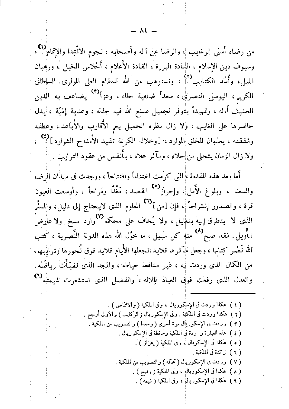 أما بعد هَذِه الْمُقدمَة، الَّتِي كرمت اختتاما وافتتاحا، وَوجدت فِي ميدان الرِّضَا والسعد، وبلوغ الأمل، وإحراز الْقَصْد، مغدا ومراحا، وأوسعت الْعُيُون قُرَّة، والصدور إنشراحا، فَإِن [من] الْمَعْلُوم الَّذِي لَا يحْتَاج إِلَى دَلِيل، وَالْمُسلم الَّذِي لَا يتَطَرَّق إِلَيْهِ بتعليل، وَلَا يخَاف على محكمه وَارِد مسخ وَلَا عَارض تَأْوِيل. فقد صَحَّ مِنْهُ كل سَبِيل، مَا خول الله هَذِه الدولة النصرية، كتب الله نصر كتابها، وَجعل مآثرها قلايد تجعلها الايام قلايد فَوق نحورها وترايبها، من الْكَمَال الَّذِي وَردت بِهِ، غير مدافعة حياطة، وَالْمجد اهذي تفيأت رياضه، وَالْعدْل الَّذِي رفعت فَوق الْعباد ظلاله، وَالْفضل الَّذِي استشعرت شيمته