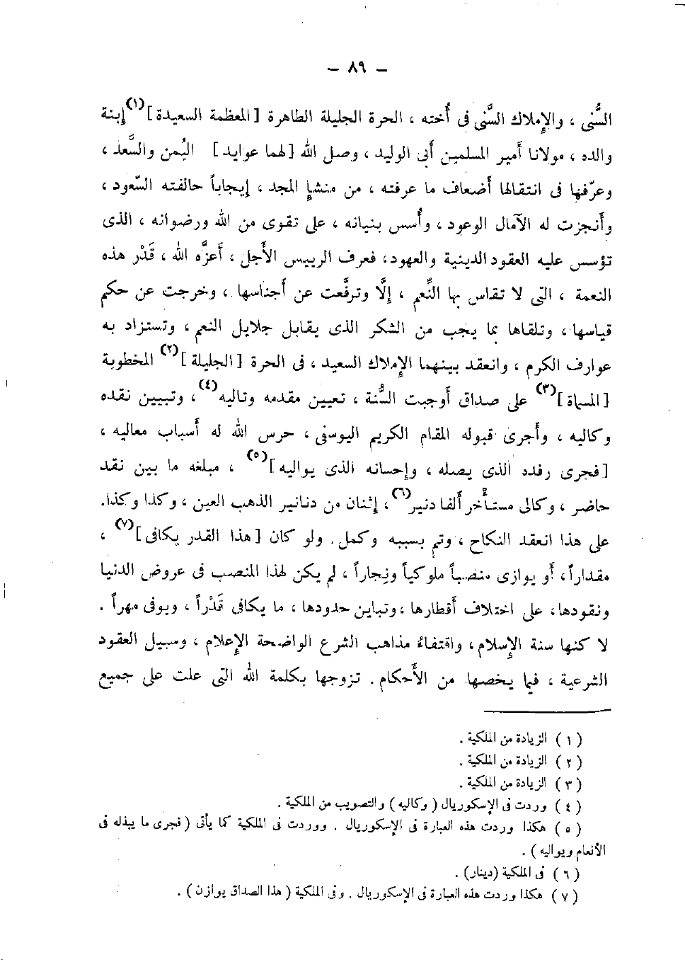 السّني، والإملاك السّني فِي أُخْته، الْحرَّة الجليلة الطاهرة [المعظمة السعيدة] إبنة وَالِده، مَوْلَانَا أَمِير الْمُسلمين أبي الْوَلِيد، وصل الله [لَهما عوايد] الْيمن والسعد، وَعرفهَا فِي انتقالها أَضْعَاف مَا عَرفته، من منشإ الْمجد، إِيجَابا حالفته السُّعُود، وأنجزت لَهُ الآمال الوعود، وَأسسَ بُنْيَانه، على تقوى من الله ورضوانه، الَّذِي تؤسس عَلَيْهِ الْعُقُود الدِّينِيَّة والعهود، فَعرف الرييس الْأَجَل، أعزه الله، قدر هَذِه النِّعْمَة، الَّتِي لَا تقاس بهَا النعم، إِلَّا وترفعت عَن أجناسها، وَخرجت عَن حكم قياسها، وتلقاها بِمَا يجب من الشُّكْر الَّذِي يُقَابل جلايل النعم، وتستزاد بِهِ عوارف الْكَرم، وانعقد بَينهمَا الإملاك السعيد، فِي الْحرَّة [الجليلة] المخطوبة [الْمُسَمَّاة] على صدَاق أوجبت السّنة، تعْيين مقدمه وتاليه، وتبيين نَقده وكاليه، وأجرى قبُوله الْمقَام الْكَرِيم اليوسفى، حرس الله لَهُ أَسبَاب معاليه، [فَجرى رفده الذى يصله، وإحسانه الذى يواليه] ، مبلغه مَا بَين نقد حَاضر، وكالي مستأخر ألفا دنير، إثنان من دَنَانِير الذَّهَب الْعين، وَكَذَا وَكَذَا. على هَذَا انْعَقَد النِّكَاح، وَتمّ بِسَبَبِهِ وكمل. وَلَو كَانَ [هَذَا الْقدر يكافي] ، مِقْدَارًا، أَو يوازي منصبا ملوكيا ونجارا، لم يكن لهَذَا المنصب فِي عرُوض الدُّنْيَا ونقودها، على اخْتِلَاف أقطارها، وتباين حُدُودهَا، مَا يكافي قدرا، ويوفي مهْرا. لَا كنها سنة الْإِسْلَام، واقتفاء مَذَاهِب الشَّرْع الْوَاضِحَة الْإِعْلَام، وسبيل الْعُقُود الشَّرْعِيَّة، فِيمَا يَخُصهَا من الْأَحْكَام. وَتَزَوجهَا بِكَلِمَة الله الَّتِي علت على جَمِيع