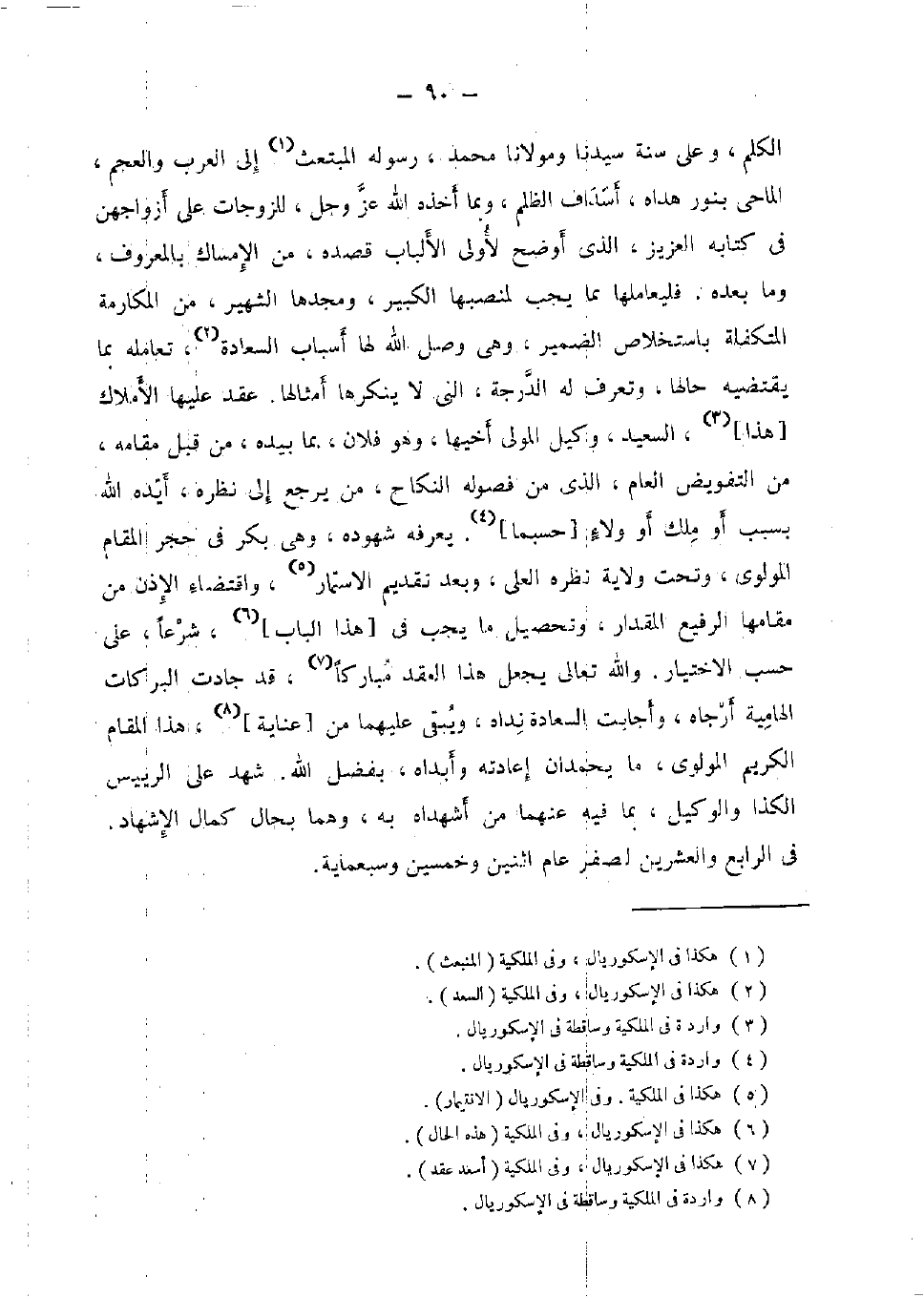 الْكَلم، وعَلى سنة سيدنَا ومولانا مُحَمَّد، رَسُوله المبتعث إِلَى الْعَرَب والعجم، الماحي بِنور هداه، أسداف الظُّلم، وَبِمَا أَخذه الله عز وَجل، لِلزَّوْجَاتِ على أَزوَاجهنَّ فِي كِتَابه الْعَزِيز، الَّذِي أوضح لأولى الْأَلْبَاب قَصده، من الْإِمْسَاك بِالْمَعْرُوفِ، وَمَا بعده. فليعاملها بِمَا يجب لمنصبها الْكَبِير، ومجدها الشهير، من المكارمة المتكفلة باستخلاص الضَّمِير، وَهِي وصل الله لَهَا أَسبَاب السَّعَادَة، تعامله بِمَا يَقْتَضِيهِ حَالهَا، وتعرف لَهُ الدرجَة، الني لَا ينكرها أَمْثَالهَا. عقد عَلَيْهَا الْأَمْلَاك [هَذَا] ، السعيد، وَكيل الْمولى أَخِيهَا، وَهُوَ فلَان، بِمَا بِيَدِهِ، من قبل مقَامه، من التَّفْوِيض الْعَام، الَّذِي من فُصُول النِّكَاح، من يرجع إِلَى نظره، أيده الله بِسَبَب أَو ملك أَو وَلَاء [حَسْبَمَا] . يعرفهُ شُهُوده، وَهِي بكر فِي حجر الْمقَام المولوي،، ونحت ولَايَة نظره العلى، وَبعد تَقْدِيم الاستمار، واقتضاء الْإِذْن من مقَامهَا الرفيع الْمِقْدَار، وَتَحْصِيل مَا يجب فِي [هَذَا الْبَاب] ، شرعا، على حسب الِاخْتِيَار. وَالله تَعَالَى يَجْعَل هَذَا العقد مُبَارَكًا، قد جَادَتْ البركات الهامية أرجاه، وأجابت السَّعَادَة نداه، ويبقي عَلَيْهِمَا من [عناية] ، هَذَا الْمقَام الْكَرِيم المولوي، مَا يحمدان إِعَادَته وأبداه، بِفضل الله. شهد على الرييس الكذا وَالْوَكِيل، بِمَا فِيهِ عَنْهُمَا من أشهداه بِهِ، وهما بِحَال كَمَال الْإِشْهَاد. فِي الرَّابِع وَالْعِشْرين لصفر عَام اثْنَيْنِ وَخمسين وسبعماية.