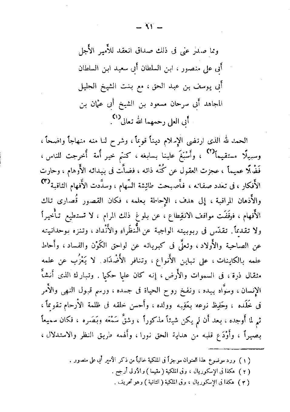 الْحَمد لله الَّذِي ارتضى الْإِسْلَام دينا قويما، وَشرح لنا مِنْهُ منهاجا وَاضحا، وسبيلا مُسْتَقِيمًا، وأسبغ علينا بسابغه، كُنْتُم خير أمة أخرجت للنَّاس، فضلا عميما، عجزت الْعُقُول عَن كنه ذَاته، فضلت فِي بيدائه الأوهام، وحارت الأفكار، فِي تعدد صِفَاته، فَأَصْبَحت طائشة السِّهَام، وسددت الأفهام الثاقبة والأذهان المراقبة، إِلَى هدف، الأحاطة بِعِلْمِهِ، فَكَانَ الْقُصُور قصارى تِلْكَ الأفهام، فوقفت مَوَاقِف الِانْقِطَاع، عَن بُلُوغ ذَلِك المرام، لَا تَسْتَطِيع تَأْخِيرا وَلَا تَقْدِيمًا. تقدس فِي ربوبيته الْوَاجِبَة عَن النظراء والأنداد، وتنزه بوحدانيته عَن الصاحبة وَالْأَوْلَاد، وتعلى فِي كبريائه عَن لواحق الْكَوْن وَالْفساد، وأحاط علمه بالكاينات، على تبَاين الْأَنْوَاع، وتنافر الأضداد لَا يعزب عَن علمه مِثْقَال ذرة، فِي السَّمَوَات وَالْأَرْض، إِنَّه كَانَ عليما حكيما. وتبارك الَّذِي أنشأ الْإِنْسَان، وسواه بِيَدِهِ , وَنفخ روح الْحَيَاة فِي جسده، ورسم قبُول النهى وَالْأَمر فِي خلده، وَحفظ نَوعه بعقبه وَولده، وَأحسن خلقه فِي ظلمَة الْأَرْحَام تقويما، ثمَّ لما أوجده، بعد أَن لم يكن شَيْئا مَذْكُورا، وشق سَمعه وبصره، فَكَانَ سميعا بَصيرًا، وأودع قلبه من هِدَايَة الْحق نورا، وألهمه طَرِيق النّظر وَالِاسْتِدْلَال