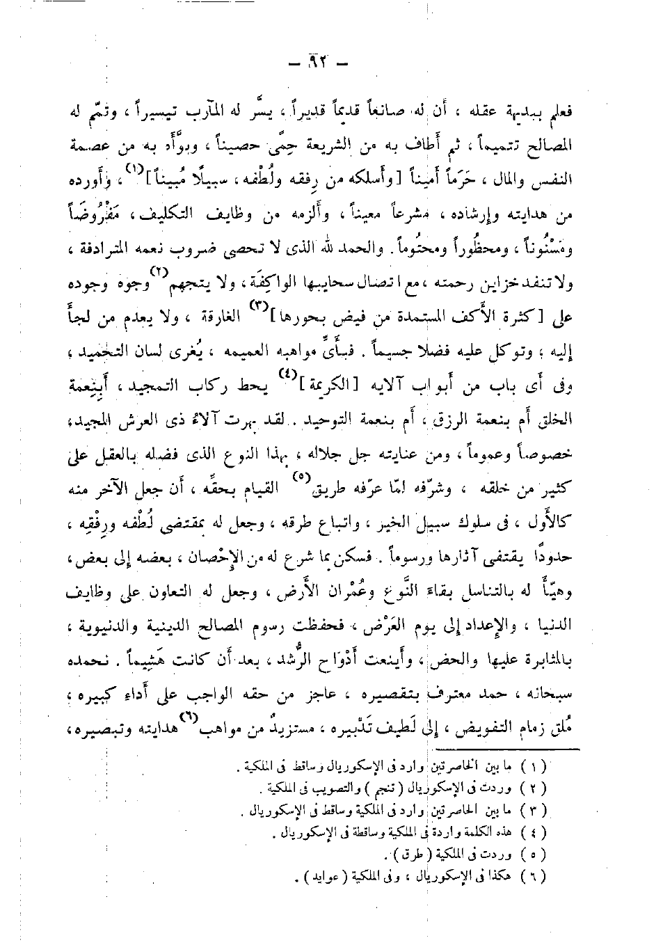 فَعلم ببديهة عقله، أَن لَهُ صانعا قَدِيما قَدِيرًا، يسر لَهُ المآرب تيسيرا، وتمم لَهُ الْمصَالح تتميما، ثمَّ أطاف بِهِ من الشَّرِيعَة حمى حصينا، وبوأه بِهِ من عصمَة النَّفس وَالْمَال، حرما أَمينا [وأسلكه من رفقه ولطفه، سَبِيلا مُبينًا] ، وَأوردهُ من هدايته وإرشاده، مشرعا معينا، وألزمه من وظايف التَّكْلِيف، مَفْرُوضًا ومسنونا، ومحظورا ومحتوما. وَالْحَمْد لله الَّذِي لَا تحصى ضروب نعمه المترادفة، وَلَا تنفد خزاين رَحمته، مَعَ اتِّصَال سحايبها الواكفة، وَلَا يتجهم وُجُوه وجوده على [كَثْرَة الأكف المستمدة من فيض بحورها] الغارقة، وَلَا يعْدم من لَجأ إِلَيْهِ وتوكل عَلَيْهِ فضلا جسيما. فَبِأَي مواهبه العميمه، يغرى لِسَان التَّحْمِيد، وَفِي أَي بَاب من أَبْوَاب آلايه [الْكَرِيمَة] يحط ركاب التمجيد، أبنعمة الْخلق أم بِنِعْمَة الرزق، أم بِنِعْمَة التَّوْحِيد. لقد بهرت آلَاء ذِي الْعَرْش الْمجِيد، خُصُوصا وعموما، وَمن عنايته جلّ جَلَاله، بِهَذَا النَّوْع الَّذِي فَضله بِالْعقلِ على كثير من خلقه، وشرفه لما عرفه طَرِيق الْقيام بِحقِّهِ، أَن جعل الآخر مِنْهُ كَالْأولِ، فِي سلوك سَبِيل الْخَيْر، وَاتِّبَاع طرقه، وَجعل لَهُ بِمُقْتَضى لطفه ورفقه، حدودا يقتفي آثارها ورسوما. فسكن بِمَا شرع لَهُ من الْإِحْصَان، بعضه إِلَى بعض، وهيأ لَهُ بالتناسل بَقَاء النَّوْع وَعمْرَان الأَرْض، وَجعل لَهُ التعاون على وظايف الدُّنْيَا، والإعداد إِلَى يَوْم الْعرض، فَحفِظت رسوم الْمصَالح الدِّينِيَّة والدنيوية، بالمثابرة عَلَيْهَا والحض، وأينعت أدواح الرشد، بعد أَن كَانَت هشيما. نحمده سُبْحَانَهُ، حمد معترف بتقصيره، عَاجز من حَقه الْوَاجِب على أَدَاء كبيره، ملق زِمَام التَّفْوِيض، إِلَى لطيف تَدْبيره، مستزيد من مواهب هدايته وتبصيره،