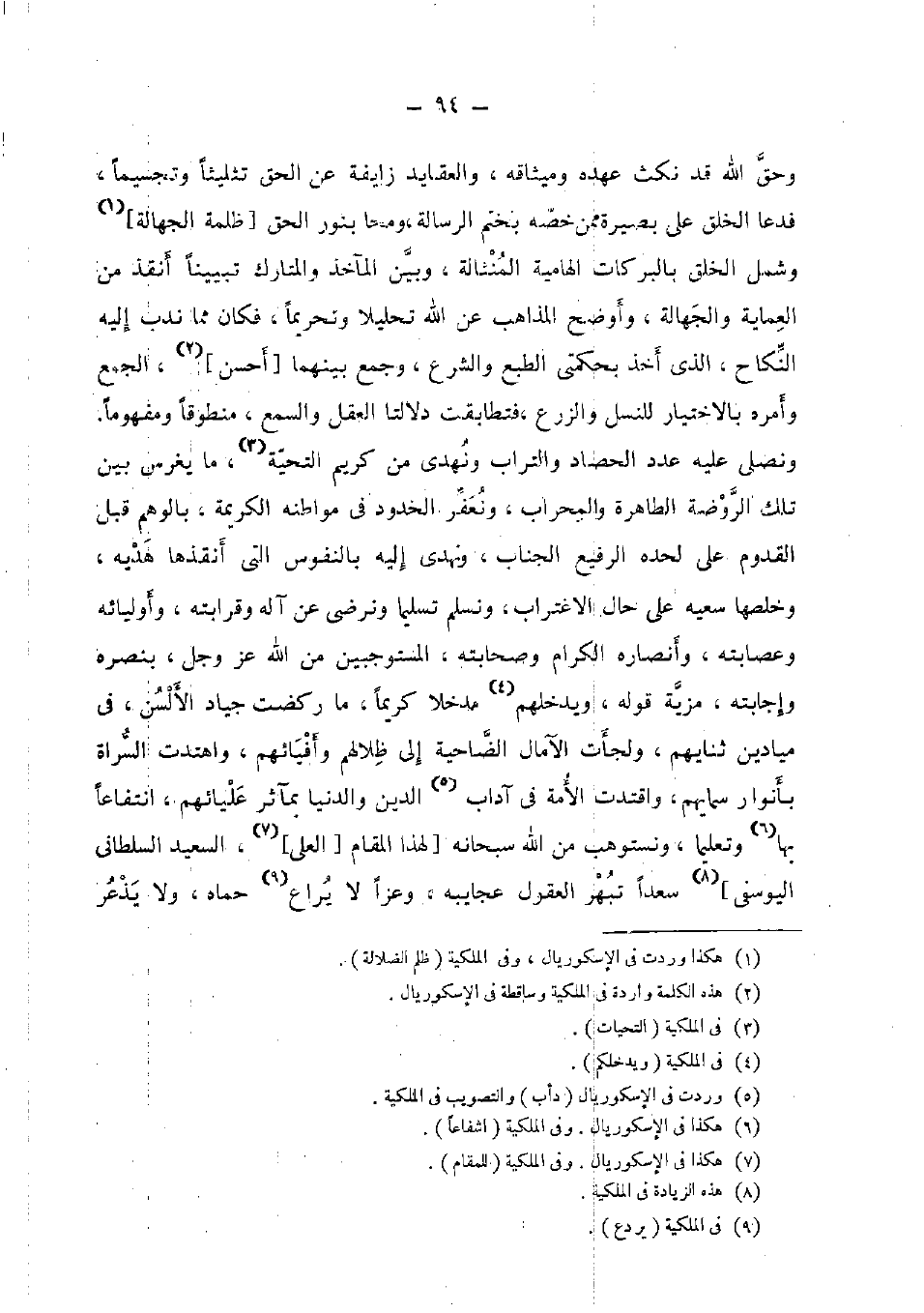 وَحقّ الله قد نكث عَهده وميثاقه، والعقايد زايفة عَن الْحق تثليثا وتجسيما، فَدَعَا الْخلق على بَصِيرَة مِمَّن خصّه بِخَتْم الرسَالَة، ومحا بِنور الْحق [ظلمَة الْجَهَالَة] وَشَمل الْخلق بالبركات الهامية المنثالة، وَبَين المآخذ والمتارك تبيينا أنقذ من العماية والجهالة، وأوضح الْمذَاهب عَن الله تحليلا وتحريما، فَكَانَ مِمَّا ندب إِلَيْهِ النِّكَاح، الَّذِي أَخذ بحكمتى الطَّبْع وَالشَّرْع , وَجمع بَينهمَا [أحسن] الْجمع , وَأمره بِالِاخْتِيَارِ للنسل وَالزَّرْع , فتطابقت دلالتا الْعقل والسمع، منطوقا ومفهوما. ونصلى عَلَيْهِ عدد الْحَصاد وَالتُّرَاب ونهدي من كريم التَّحِيَّة، مَا يغْرس بَين تِلْكَ الرَّوْضَة الطاهرة والمحراب، ونعفر الخدود فِي مواطنه الْكَرِيمَة، بالوهم قبل الْقدوم على لحده الرفيع الجناب، ونهدي إِلَيْهِ بالنفوس الَّتِي أنقذها هَدْيه، وخلصها سَعْيه على حَال الاغتراب، ونسلم تَسْلِيمًا وَنرْضى عَن آله وقرابته، وأوليائه وعصابته، وأنصاره الْكِرَام وصحابته، المستوجبين من الله عز وَجل، بنصره وإجابته، مزية قَوْله، ويدخلهم مدخلًا كَرِيمًا، مَا ركضت جِيَاد الألسن، فِي ميادين ثنايهم، ولجأت الآمال الضاحية إِلَى ظلالهم وأفيائهم، واهتدت السراة بأنوار سمايهم، واقتدت الْأمة فِي آدَاب الدّين وَالدُّنْيَا بمآثر عليائهم، انتفاعا بهَا وتعليما، ونستوهب من الله سُبْحَانَهُ [لهَذَا الْمقَام الْعلي] ، السعيد السلطاني اليوسفي] سَعْدا تبهر الْعُقُول عجايبه، وَعزا لَا يراع حماه، وَلَا يذعر