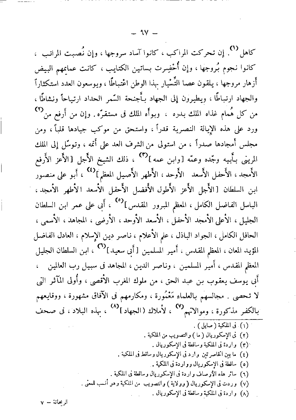 كَاهِل. إِن تحركت المراكب، كَانُوا آساد سُرُوجهَا، وَأَن نصبت الْمَرَاتِب، كَانُوا نُجُوم بروجها، وَإِن أحضرت بساتين الكتايب، كَانَت عمايمهم الْبيض أزهار مروجها، يلقون عَصا التسيار بِهَذَا الوطن اعتباطا، ويوسعون الْعدَد استكثارا وَالْجهَاد ارتباطا، ويطيرون إِلَى الْجِهَاد بأجنحة السمر الْحداد ارتياحا ونشاطا، من كل همام غذاه الْملك بدره، وبوأه الْملك فِي مستقره. وَإِن من أرفع من ورد على هَذِه الإيالة النصرية قدرا، وَاسْتحق من موكب جيادها قلبا، وَمن مجْلِس أمجادها صَدرا، من استولى من الشّرف الْعد على أتمه، وتوسل إِلَى الْملك المريني بِأَبِيهِ وجده وَعَمه [وَابْن عَمه] ، ذَلِك الشَّيْخ الْأَجَل [الْأَعَز الأرفع الأمجد، الأحفل الأسعد الأوحد، الأطهر الْأَصِيل الْمُعظم] ، أَبُو عَليّ مَنْصُور ابْن السُّلْطَان [الْأَجَل الْأَعَز الأطول الْأَفْضَل الأحفل الأسعد الأطهر الأمجد، الباسل الْفَاضِل الْكَامِل، الْمُعظم المبرور الْمُقَدّس] ، أبي عَليّ عمر ابْن السُّلْطَان الْجَلِيل، الْأَعْلَى الأمجد الأحفل، الأسعد الأوحد، الأرضي، الْمُجَاهِد، الأسمى، الحافل الْكَامِل، الْجواد الْبَاذِل، علم الْأَعْلَام، نَاصِر دين الْإِسْلَام، الْعَادِل الْفَاضِل الْمُؤَيد المعان، الْمُعظم الْمُقَدّس، أَمِير الْمُسلمين [أبي سعيد] ، ابْن السُّلْطَان الْجَلِيل الْمُعظم الْمُقَدّس، أَمِير الْمُسلمين، وناصر الدّين، الْمُجَاهِد فِي سَبِيل رب الْعَالمين، أبي يُوسُف يَعْقُوب بن عبد الْحق، من مُلُوك الْمغرب الْأَقْصَى، وَأولى المآثر الَّتِي لَا تحصى. مجَالِسهمْ بالعلماء معمورة، ومكارمهم فِي الْآفَاق مَشْهُورَة، ووقايعهم بالْكفْر مَذْكُورَة، وموالاتهم، لأملاك [الْجِهَاد] ، بِهَذِهِ الْبِلَاد، فِي صحف