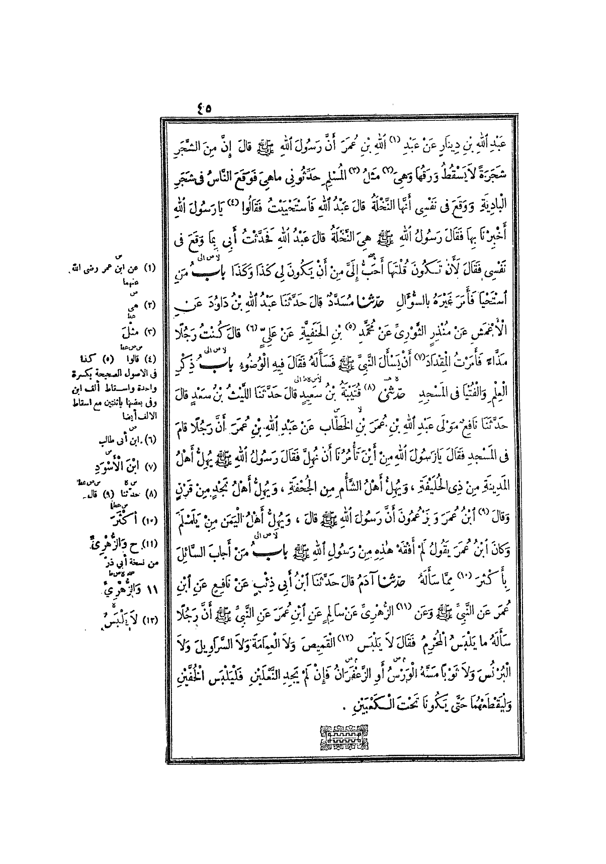 133- حَدَّثَنِي قُتَيْبَةُ بْنُ سَعِيدٍ قَالَ : حَدَّثَنَا اللَّيْثُ بْنُ سَعْدٍ قَالَ : حَدَّثَنَا نَافِعٌ مَوْلَى عَبْدِ اللهِ بْنِ عُمَرَ بْنِ الْخَطَّابِ ، عَنْ عَبْدِ اللهِ بْنِ عُمَرَ أَنَّ رَجُلاً قَامَ فِي الْمَسْجِدِ فَقَالَ يَا رَسُولَ اللهِ مِنْ أَيْنَ تَأْمُرُنَا أَنْ نُهِلَّ ، فَقَالَ رَسُولُ اللهِ صلى الله عليه وسلم يُهِلُّ أَهْلُ الْمَدِينَةِ مِنْ ذِي الْحُلَيْفَةِ وَيُهِلُّ أَهْلُ الشَّامِ مِنَ الْجُحْفَةِ وَيُهِلُّ أَهْلُ نَجْدٍ مِنْ قَرْنٍ وَقَالَ ابْنُ عُمَرَ وَيَزْعُمُونَ أَنَّ رَسُولَ اللهِ صلى الله عليه وسلم قَالَ : وَيُهِلُّ أَهْلُ الْيَمَنِ مِنْ يَلَمْلَمَ ، وَكَانَ ابْنُ عُمَرَ يَقُولُ لَمْ أَفْقَهْ هَذِهِ مِنْ رَسُولِ اللهِ صلى الله عليه وسلم.