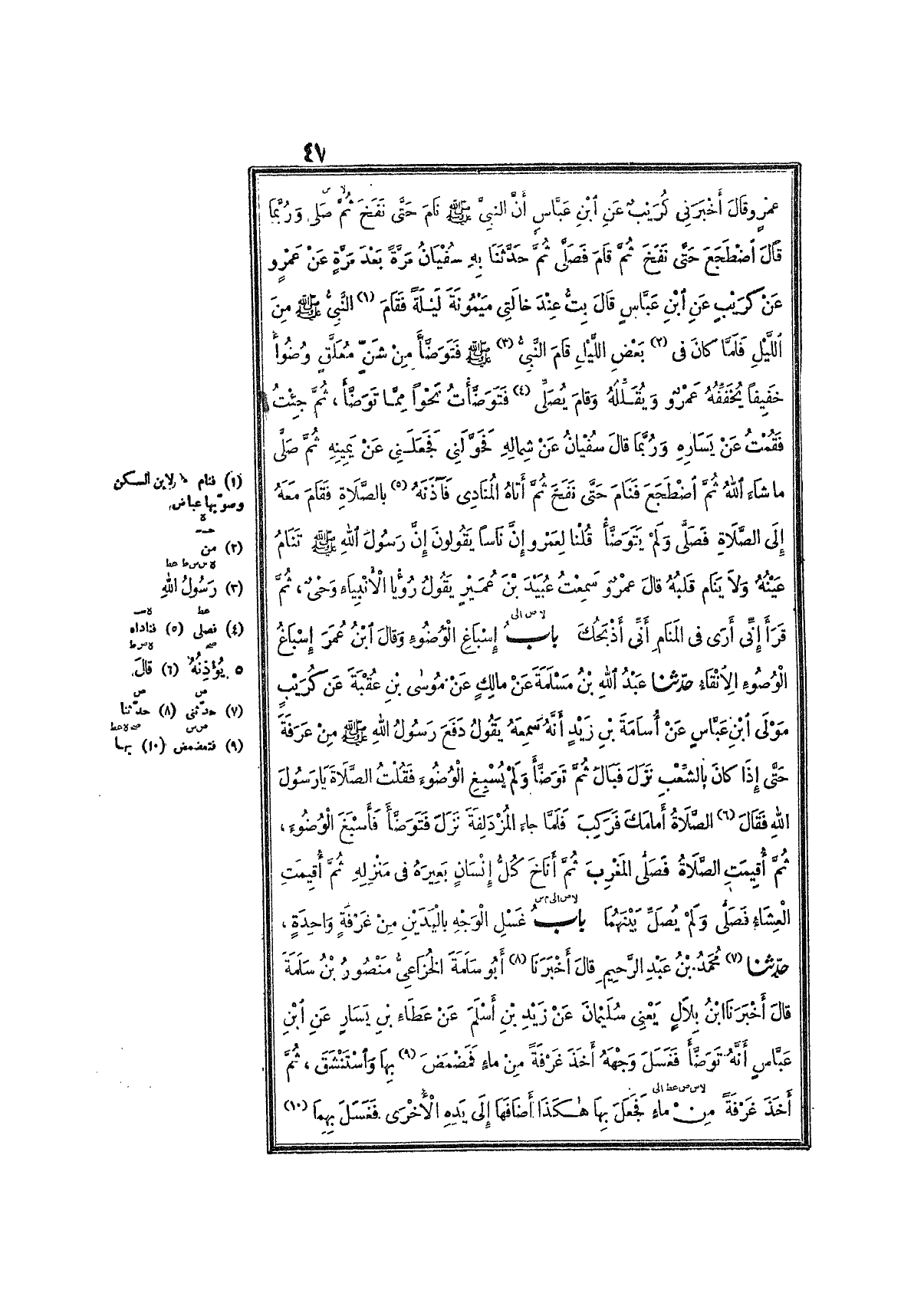 عَمْرٍو قَالَ : أَخْبَرَنِي كُرَيْبٌ ، عَنِ ابْنِ عَبَّاسٍ أَنَّ النَّبِيَّ صلى الله عليه وسلم نَامَ حَتَّى نَفَخَ ثُمَّ صَلَّى ، وَرُبَّمَا قَالَ اضْطَجَعَ حَتَّى نَفَخَ ، ثُمَّ قَامَ فَصَلَّى ثُمَّ ، حَدَّثَنَا بِهِ سُفْيَانُ مَرَّةً بَعْدَ مَرَّةٍ عَنْ عَمْرٍو عَنْ كُرَيْبٍ ، عَنِ ابْنِ عَبَّاسٍ قَالَ بِتُّ عِنْدَ خَالَتِي مَيْمُونَةَ لَيْلَةً فَقَامَ النَّبِيُّ صلى الله عليه وسلم مِنَ اللَّيْلِ فَلَمَّا كَانَ فِي بَعْضِ اللَّيْلِ قَامَ النَّبِيُّ صلى الله عليه وسلم فَتَوَضَّأَ مِنْ شَنٍّ مُعَلَّقٍ وُضُوءًا خَفِيفًا - يُخَفِّفُهُ عَمْرٌو وَيُقَلِّلُهُ - وَقَامَ يُصَلِّي فَتَوَضَّأْتُ نَحْوًا مِمَّا تَوَضَّأَ ثُمَّ جِئْتُ فَقُمْتُ عَنْ يَسَارِهِ ، وَرُبَّمَا قَالَ سُفْيَانُ ، عَنْ شِمَالِهِ - فَحَوَّلَنِي فَجَعَلَنِي عَنْ يَمِينِهِ ثُمَّ صَلَّى مَا شَاءَ اللَّهُ ثُمَّ اضْطَجَعَ فَنَامَ حَتَّى نَفَخَ ثُمَّ أَتَاهُ الْمُنَادِي فَآذَنَهُ بِالصَّلاَةِ فَقَامَ مَعَهُ إِلَى الصَّلاَةِ فَصَلَّى وَلَمْ يَتَوَضَّأْ قُلْنَا لِعَمْرٍو إِنَّ نَاسًا يَقُولُونَ إِنَّ رَسُولَ اللهِ صلى الله عليه وسلم تَنَامُ عَيْنُهُ ، وَلاَ يَنَامُ قَلْبُهُ.