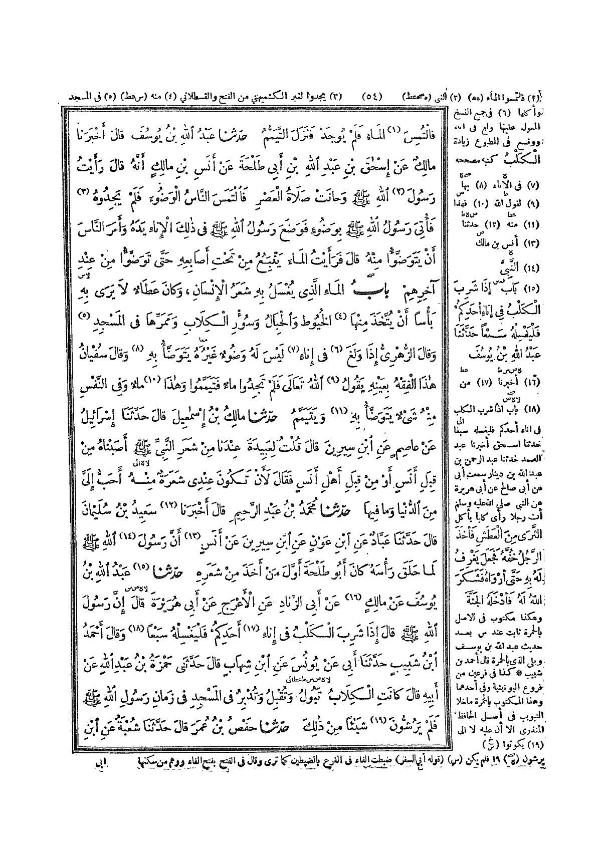 طَلْحَةَ ، عَنْ أَنَسِ بْنِ مَالِكٍ أَنَّهُ قَالَ رَأَيْتُ رَسُولَ اللهِ A وَحَانَتْ صَلاَةُ الْعَصْرِ فَالْتَمَسَ النَّاسُ الْوَضُوءَ فَلَمْ يَجِدُوهُ فَأُتِيَ رَسُولُ اللهِ A بِوَضُوءٍ فَوَضَعَ رَسُولُ اللهِ A فِي ذَلِكَ الإِنَاءِ يَدَهُ وَأَمَرَ النَّاسَ أَنْ يَتَوَضَّؤُوا مِنْهُ قَالَ فَرَأَيْتُ الْمَاءَ يَنْبُعُ مِنْ تَحْتِ أَصَابِعِهِ حَتَّى تَوَضَّؤُوا مِنْ عِنْدِ آخِرِهِمْ.