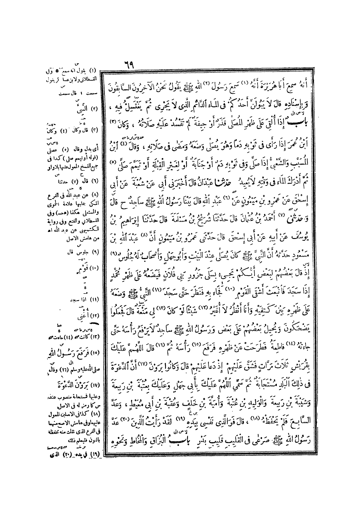 240- حَدَّثَنَا عَبْدَانُ قَالَ Y أَخْبَرَنِي أَبِي ، عَنْ شُعْبَةَ ، عَنْ أَبِي إِسْحَاقَ ، عَنْ عَمْرِو بْنِ مَيْمُونٍ ، عَنْ عَبْدِ اللهِ ، قَالَ Y بَيْنَا رَسُولُ اللهِ A سَاجِدٌ (ح) قَالَ Y وَحَدَّثَنِي أَحْمَدُ بْنُ عُثْمَانَ قَالَ Y حَدَّثَنَا شُرَيْحُ بْنُ مَسْلَمَةَ قَالَ Y حَدَّثَنَا إِبْرَاهِيمُ بْنُ يُوسُفَ ، عَنْ أَبِيهِ ، عَنْ أَبِي إِسْحَاقَ ، قَالَ Y حَدَّثَنِي عَمْرُو بْنُ مَيْمُونٍ أَنَّ عَبْدَ اللهِ بْنَ مَسْعُودٍ حَدَّثَهُ أَنَّ النَّبِيَّ A كَانَ يُصَلِّي عِنْدَ الْبَيْتِ ، وَأَبُو جَهْلٍ وَأَصْحَابٌ لَهُ جُلُوسٌ إِذْ قَالَ بَعْضُهُمْ لِبَعْضٍ أَيُّكُمْ يَجِيءُ بِسَلَى جَزُورِ بَنِي فُلاَنٍ فَيَضَعُهُ عَلَى ظَهْرِ مُحَمَّدٍ إِذَا سَجَدَ فَانْبَعَثَ أَشْقَى الْقَوْمِ فَجَاءَ بِهِ فَنَظَرَ حَتَّى إِذَا سَجَدَ النَّبِيُّ A وَضَعَهُ عَلَى ظَهْرِهِ بَيْنَ كَتِفَيْهِ وَأَنَا أَنْظُرُ لاَ أُغَيِّرُ شَيْئًا لَوْ كَانَ لِي مَنْعَةٌ قَالَ فَجَعَلُوا يَضْحَكُونَ وَيُحِيلُ بَعْضُهُمْ عَلَى بَعْضٍ وَرَسُولُ اللهِ A سَاجِدٌ لاَ يَرْفَعُ رَأْسَهُ حَتَّى جَاءَتْهُ فَاطِمَةُ فَطَرَحَتْ عَنْ ظَهْرِهِ فَرَفَعَ رَأْسَهُ ثُمَّ قَالَ اللَّهُمَّ عَلَيْكَ بِقُرَيْشٍ ثَلاَثَ مَرَّاتٍ فَشَقَّ عَلَيْهِمْ إِذْ دَعَا عَلَيْهِمْ- قَالَ وَكَانُوا يُرَوْنَ أَنَّ الدَّعْوَةَ فِي ذَلِكَ الْبَلَدِ مُسْتَجَابَةٌ ، ثُمَّ سَمَّى اللَّهُمَّ عَلَيْكَ بِأَبِي جَهْلٍ وَعَلَيْكَ بِعُتْبَةَ بْنِ رَبِيعَةَ وَشَيْبَةَ بْنِ رَبِيعَةَ وَالْوَلِيدِ بْنِ عُتْبَةَ وَأُمَيَّةَ بْنِ خَلَفٍ وَعُقْبَةَ بْنِ أَبِي مُعَيْطٍ وَعَدَّ السَّابِعَ فَلَمْ يَحْفَظْهُ قَالَ فَوَالَّذِي نَفْسِي بِيَدِهِ لَقَدْ رَأَيْتُ الَّذِينَ عَدَّ رَسُولُ اللهِ A صَرْعَى فِي الْقَلِيبِ قَلِيبِ بَدْرٍ
