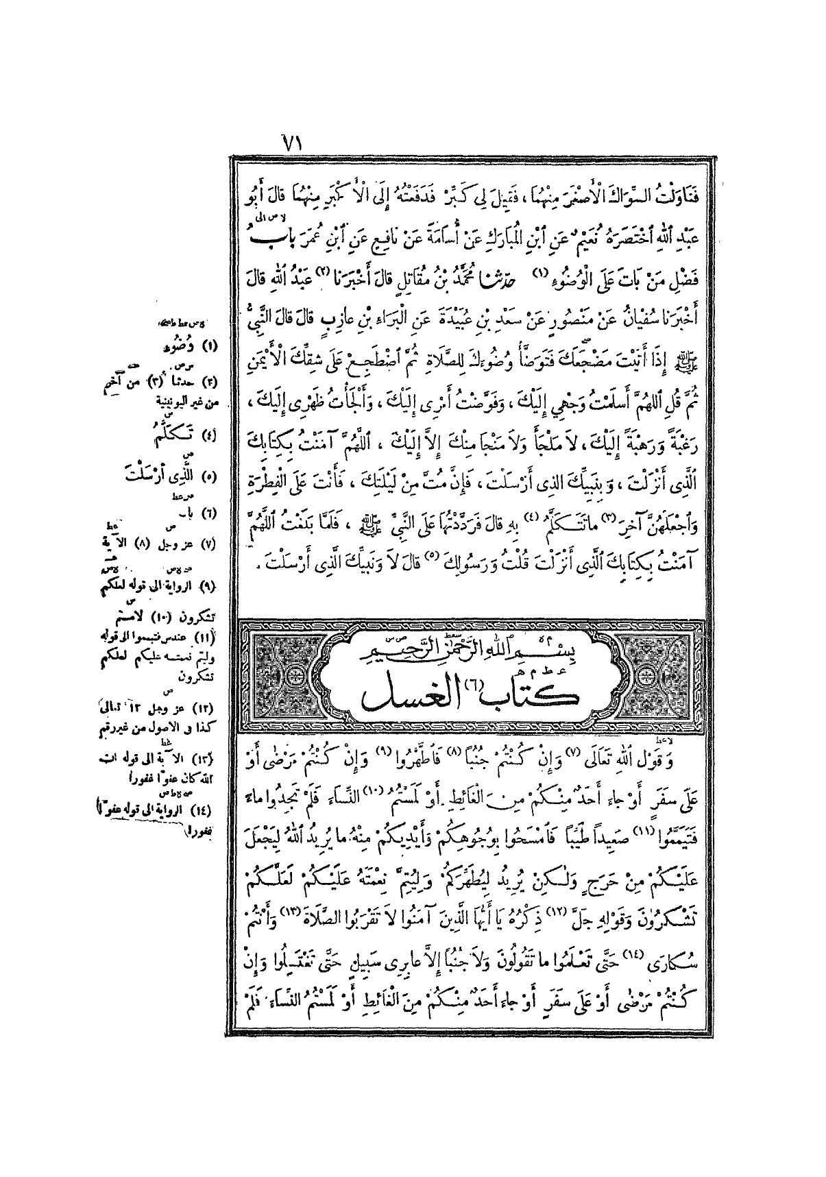 وَقَوْلِ اللهِ تَعَالَى Y {وَإِنْ كُنْتُمْ جُنُبًا فَاطَّهَّرُوا وَإِنْ كُنْتُمْ مَرْضَى ، أَوْ عَلَى سَفَرٍ ، أَوْ جَاءَ أَحَدٌ مِنْكُمْ مِنَ الْغَائِطِ ، أَوْ لاَمَسْتُمُ النِّسَاءَ فَلَمْ تَجِدُوا مَاءً فَتَيَمَّمُوا صَعِيدًا طَيِّبًا فَامْسَحُوا بِوُجُوهِكُمْ وَأَيْدِيكُمْ مِنْهُ مَا يُرِيدُ اللَّهُ لِيَجْعَلَ عَلَيْكُمْ مِنْ حَرَجٍ وَلَكِنْ يُرِيدُ لِيُطَهِّرَكُمْ وَلِيُتِمَّ نِعْمَتَهُ عَلَيْكُمْ لَعَلَّكُمْ تَشْكُرُونَ}.
