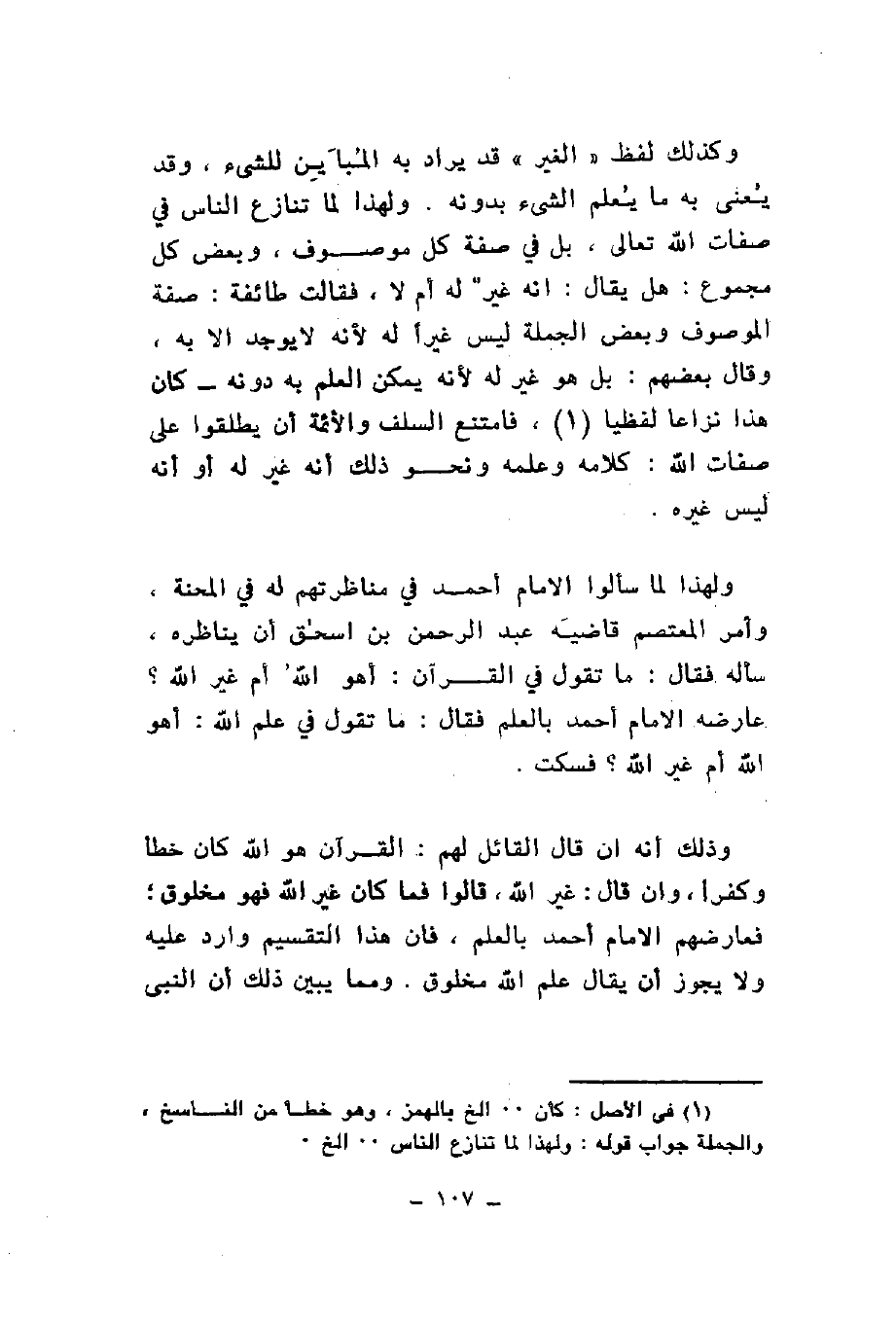 وكذلك لفظ الغير قد يراد به المباين للشيء وقد يعني به ما يعلم الشيء بدونه ولهذا لما تنازع الناس في صفات الله تعالى بل في صفة كل موصوف وبعض كل مجموع هل يقال أنه غير له أم لا فقالت طائفة صفة الموصوف وبعض الجملة ليس غيرا له لأنه لا يوجد إلا به وقال بعضهم بل هو غير له لأنه يمكن العلم به دونه كان هذا نزاعا لفظيا فامتنع السلف والأئمة أن يطلقوا على صفات الله كلامه وعلمه ونحو ذلك أنه غير له أو أنه ليس غيره ولهذا لما سألوا الإمام أحمد في مناظرتهم له في المحنة وأمر المعتصم قاضيه عبد الرحمن بن إسحق أن يناظره سأله فقال ما تقول في القرآن أهو الله أم غير الله عارضه الإمام أحمد بالعلم فقال ما تقول في علم الله أهو الله أم غير الله فسكت وذلك أنه إن قال القائل لهم القرآن هو الله كان خطأ وكفرا وإن قال غير الله قالوا فما كان غير الله فهو مخلوق فعارضهم الإمام أحمد بالعلم فإن هذا التقسيم وارد عليه ولا يجوز أن يقال علم الله مخلوق ومما يبين ذلك أن النبي