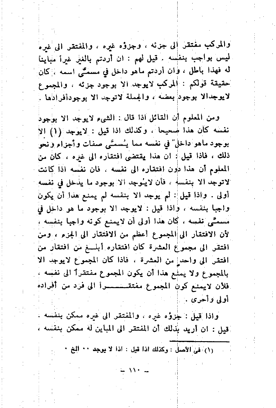 ومن المعلوم أن القائل إذا قال الشيء لا يوجد إلا بوجود نفسه كان هذا صحيحا وكذلك إذا قيل لا يوجد إلا بوجود ما هو داخل في نفسه مما يسمى صفات وأجزاء ونحو ذلك فإذا قيل أن هذا يقتضي افتقاره إلى غيره كان من المعلوم أن هذا دون افتقاره إلى نفسه فإن نفسه إذا كانت لا توجد إلا بنفسه فأن لا يوجد إلا بوجود ما يدخل في نفسه أولى وإذا قيل لم يوجد إلا بنفسه لم يمنع هذا أن يكون واجبا بنفسه وإذا قيل لا يوجد إلا بوجود ما هو داخل في مسمى نفسه كان هذا اولى أن لا يمنع كونه واجبا بنفسه لأن الافتقار إلى المجموع أعظم من الافتقار إلى الجزء ومن افتقر إلى مجموع العشرة كان افتقاره أبلغ من افتقار من افتقر إلى واحد من العشرة فإذا كان المجموع لا يوجد إلا بالمجموع ولا يمنع هذا أن يكون المجموع مفتقرا إلى نفسه فلأن لا يمنع كون المجموع مفتقرا إلى فرد من أفراده أولى وأحرى