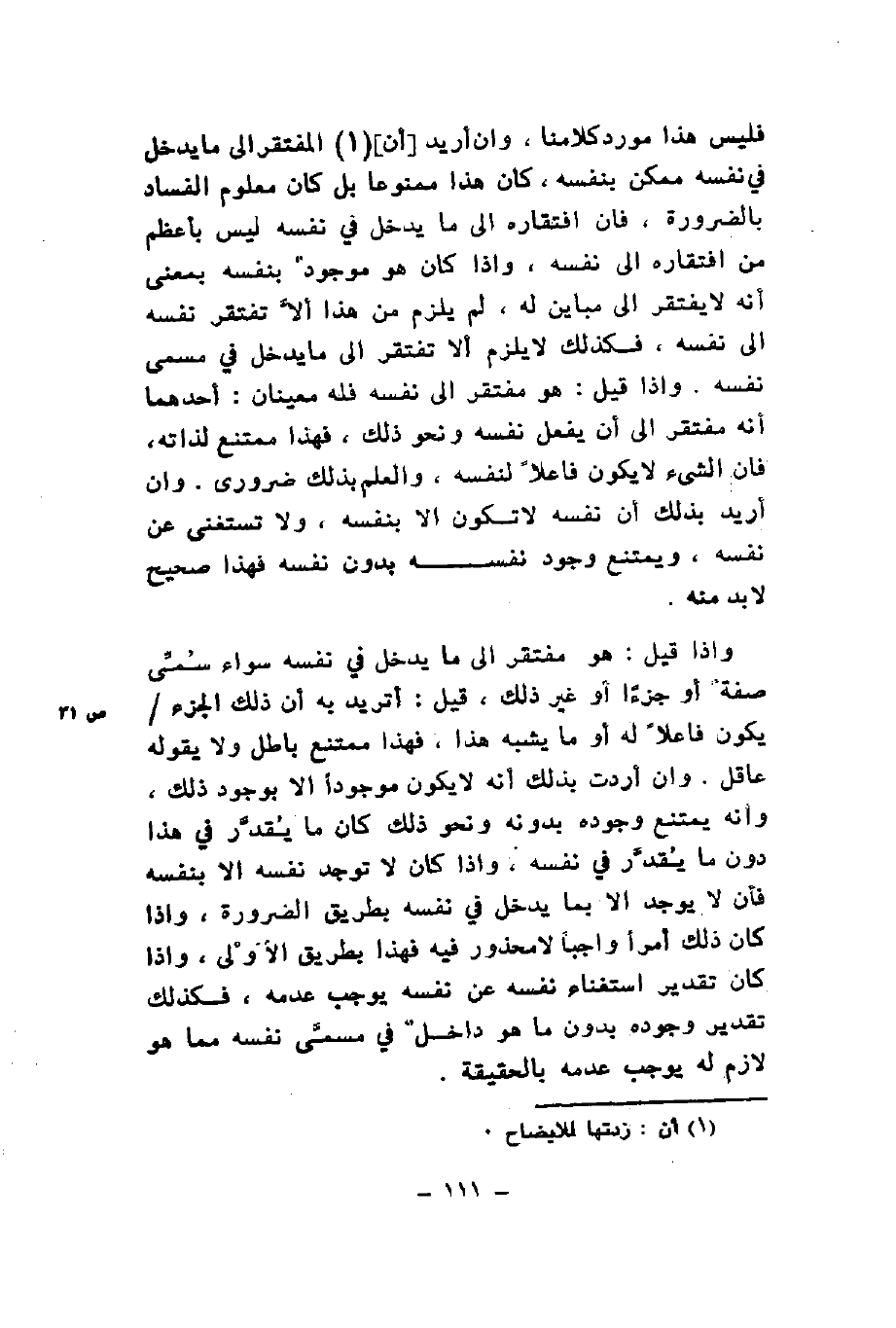فليس هذا مورد كلامنا وإن أريد أن المفتقر إلى ما يدخل في نفسه ممكن بنفسه كان هذا ممنوعا بل كان معلوم الفساد بالضرورة فإن افتقاره إلى ما يدخل في نفسه ليس بأعظم من افتقاره إلى نفسه وإذا كان هو موجود بنفسه بمعنى أنه لا يفتقر إلى مباين له لم يلزم من هذا ألا تفتقر نفسه إلى نفسه فكذلك لا يلزم ألا تفتقر إلى ما يدخل في مسمى نفسه وإذا قيل هو مفتقر إلى نفسه فله معينان أحدهما أنه مفتقر إلى أن يفعل نفسه ونحو ذلك فهذا ممتنع لذاته فإن الشيء لا يكون فاعلا لنفسه والعلم بذلك ضروري وإن أريد بذلك أن نفسه لا تكون إلا بنفسه ولا تستغني عن نفسه ويمتنع وجود نفسه بدون نفسه فهذا صحيح لا بد منه