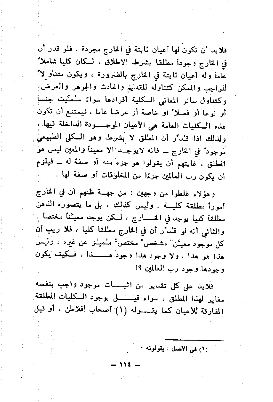 وهؤلاء غلطوا من وجهين من جهة ظنهم أن في الخارج أمورا مطلقة كلية وليس كذلك بل ما يتصوره الذهن مطلقا كليا يوجد في الخارج لكن يوجد معينا مختصا والثاني أنه لو قدر أن في الخارج مطلقا كليا فلا ريب أن كل موجود معين مشخص مختص مميز عن غيره وليس هذا هو هذا ولا وجود هذا وجود هذا فكيف يكون وجودها وجود رب العالمين فلا بد على كل تقدير من إثبات موجود واجب بنفسه مغاير لهذا المطلق سواء قيل بوجود الكليات المطلقة المفارقة للأعيان كما يقوله أصحاب أفلاطن أو قيل