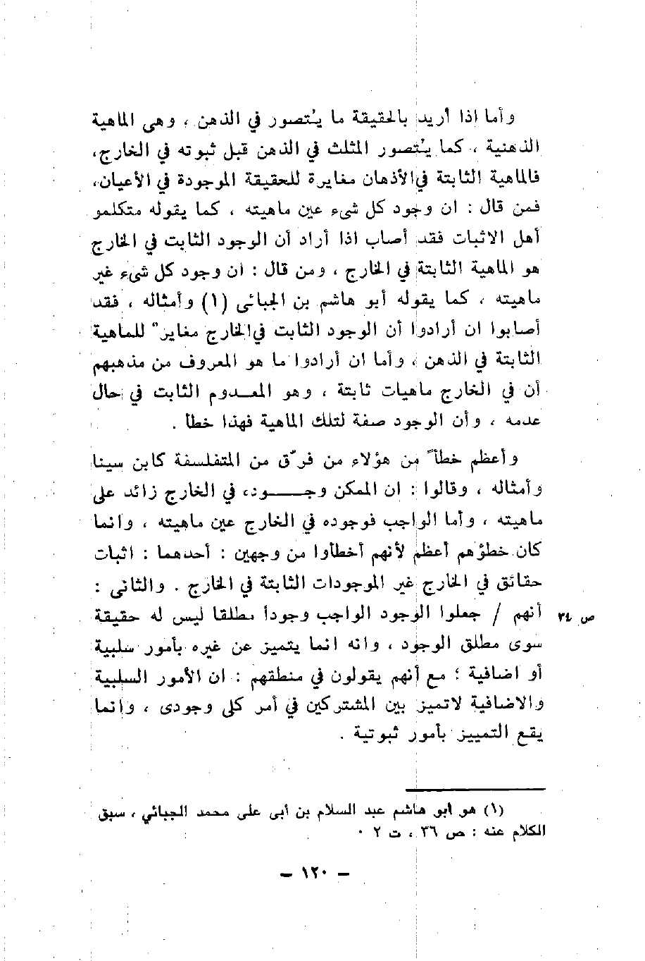 وأما إذا أريد بالحقيقة ما يتصور في الذهن وهي الماهية الذهنية كما يتصور المثلث في الذهن قبل ثبوته في الخارج فالماهية الثابتة في الأذهان مغايرة للحقيقة الموجودة في الأعيان فمن قال أن وجود كل شيء عين ماهيته كما يقوله متكلمو أهل الأثبات فقد أصاب إذا أراد أن الوجود الثابت في الخارج هو الماهية الثابتة في الخارج ومن قال ان وجود كل شيء غير ماهيته كما يقوله أبو هاشم بن الجبائي وأمثاله فقد أصابوا إن أرادوا أن الوجود الثابت في الخارج مغاير للماهية الثابتة في الذهن وأما إن أرادوا ما هو المعروف من مذهبهم أن في الخارج ماهيات ثابتة وهو المعدوم الثابت في حال عدمه وأن الوجود صفة لتلك الماهية فهذا خطأ