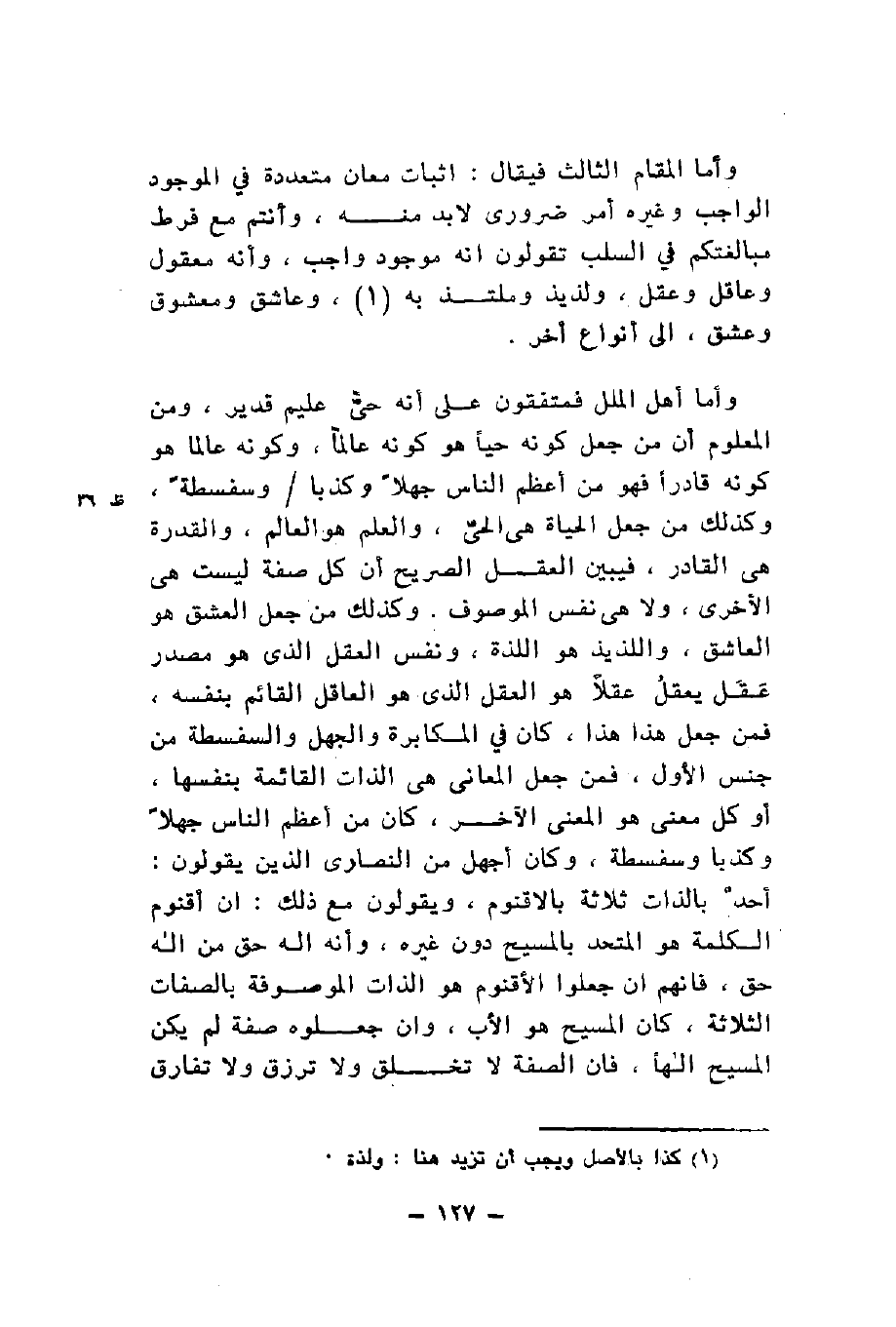 وأما المقام الثالث فيقال إثبات معان متعددة في الموجود الواجب وغيره أمر ضروري لا بد منه وأنتم مع فرط مبالغتكم في السلب تقولون أنه موجود واجب وأنه معقول وعاقل وعقل ولذيذ وملتذ به وعاشق ومعشوق وعشق إلى أنواع أخر