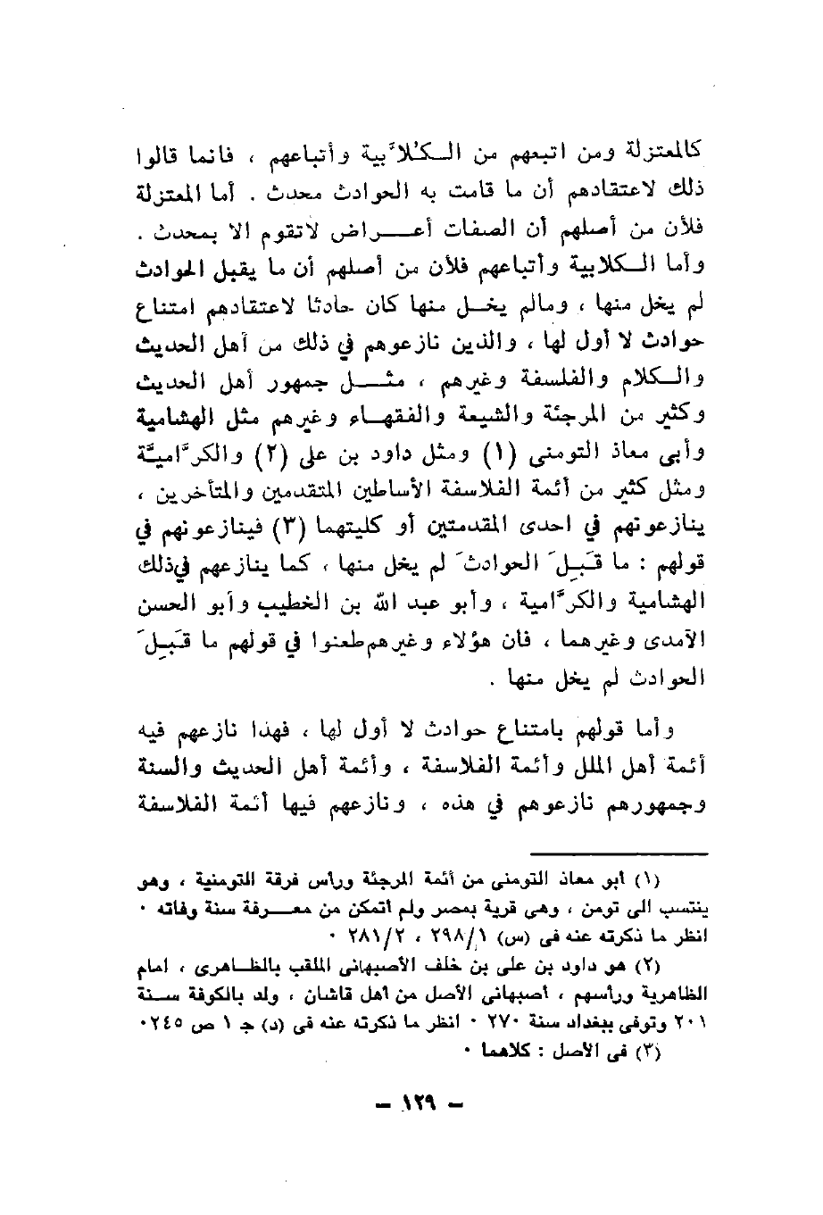 كالمعتزلة ومن اتبعهم من الكلابية وأتباعهم فإنما قالوا ذلك لاعتقادهم أن ما قامت به الحوادث محدث أما المعتزلة فلأن من أصلهم أن الصفات أعراض لا تقوم إلا بمحدث وأما الكلابية وأتباعهم فلأن من أصلهم أن ما يقبل الحوادث لم يخل منها وما لم يخل منها كان حادثا لاعتقادهم امتناع حوادث لا أول لها والذين نازعوهم في ذلك من أهل الحديث والكلام والفلسفة وغيرهم مثل جمهور أهل الحديث وكثير من المرجئة والشيعة والفقهاء وغيرهم مثل الهشامية وأبي معاذ التومني ومثل داود بن علي والكرامية ومثل كثير من أئمة الفلاسفة الأساطين المتقدمين والمتأخرين ينازعونهم في إحدى المقدمتين أو كليتهما فينازعونهم في قولهم ما قبل الحوادث لم يخل منها كما ينازعهم في ذلك الهشامية والكرامية وأبو عبد الله بن الخطيب وأبو الحسن الآمدي وغيرهما فإن هؤلاء وغيرهم طعنوا في قولهم ما قبل الحوادث لم يخل منها