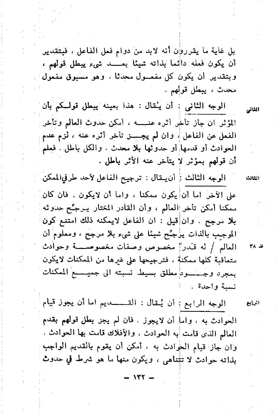 الوجه الرابع أن يقال القديم إما أن يجوز قيام الحوادث به وإما أن لا يجوز فإن لم يجز بطل قولهم بقدم العالم الذي قامت به الحوادث والأفلاك قامت بها الحوادث وإن جاز قيام الحوادث به أمكن أن يقوم بالقديم الواجب بذاته حوادث لا تتناهى ويكون منها ما هو شرط في حدوث