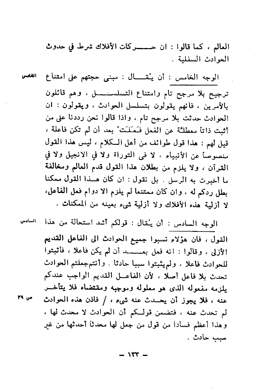 الوجه الخامس أن يقال مبنى حجتهم على امتناع ترجيح بلا مرجح تام وامتناع التسلسل وهم قائلون بالأمرين فإنهم يقولون بتسلسل الحوادث ويقولون أن الحوادث حدثت بلا مجرح تام وإذا قالوا نحن رددنا على من أثبت ذاتا معطلة عن الفعل فعلت بعد أن لم تكن فاعلة قيل لهم هذا قول طوائف من أهل الكلام ليس هذا القول منصوصا عن الأنبياء لا في التوارة ولا في الإنجيل ولا في القرآن ولا يلزم من بطلان هذا القول قدم العالم ومخالفة ما أخبرت به الرسل بل نقول إن كان هذا القول ممكنا بطل ردكم له وإن كان ممتنعا لم يلزم إلا دوام فعل الفاعل لا أزلية هذه الأفلاك ولا أزلية شيء بعينه من الممكنات