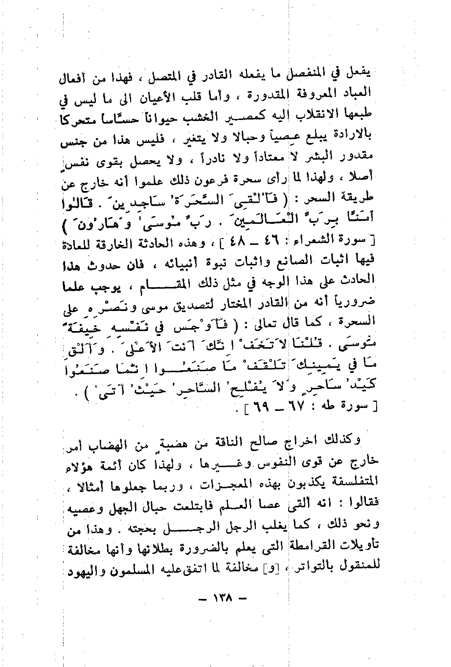 يفعل في المنفصل ما يفعله القادر في المتصل فهذا من أفعال العباد المعروفة المقدروة وأما قلب الأعيان إلى ما ليس في طبعها الانقلاب إليه كمصير الخشب حيوانا حساسا متحركا بالإرادة يبلغ عصيا وحبالا ولا يتغير فليس هذا من جنس مقدور البشر لا معتادا ولا نادرا ولا يحصل بقوى نفس أصلا ولهذا لما رأى سحرة فرعون ذلك علموا أنه خارج عن طريقة السحر {فَأُلْقِيَ السَّحَرَةُ سَاجِدِينَ قَالُوا آمَنَّا بِرَبِّ الْعَالَمِينَ رَبِّ مُوسَى وَهَارُونَ} وهذه الحادثة الخارقة للعادة فيها إثبات الصانع وإثبات نبوة أنبيائه فإن حدوث هذا الحادث على هذا الوجه في مثل ذلك المقام يوجب علما ضروريا أنه من القادر المختار لتصديق موسى ونصره على السحرة كما قال تعالى {فَأَوْجَسَ فِي نَفْسِهِ خِيفَةً مُوسَى قُلْنَا لا تَخَفْ إِنَّكَ أَنْتَ الْأَعْلَى وَأَلْقِ مَا فِي يَمِينِكَ تَلْقَفْ مَا صَنَعُوا إِنَّمَا صَنَعُوا كَيْدُ سَاحِرٍ وَلا يُفْلِحُ السَّاحِرُ حَيْثُ أَتَى} وكذلك إخراج صالح الناقة من هضبة من الهضاب أمر خارج عن قوى النفوس وغيرها ولهذا كان أئمة هؤلاء المتفلسفة يكذبون بهذه المعجزات وربما جعلوها أمثالا فقالوا إنه ألقى عصا العلم فابتلعت حبال الجهل وعصيه ونحو ذلك كما يغلب الرجل الرجل بحجته وهذا من تأويلات القرامطة التي يعلم بالضرورة بطلانها وأنها مخالفة للمنقول بالتواتر ومخالفة لما اتفق عليه المسلمون واليهود