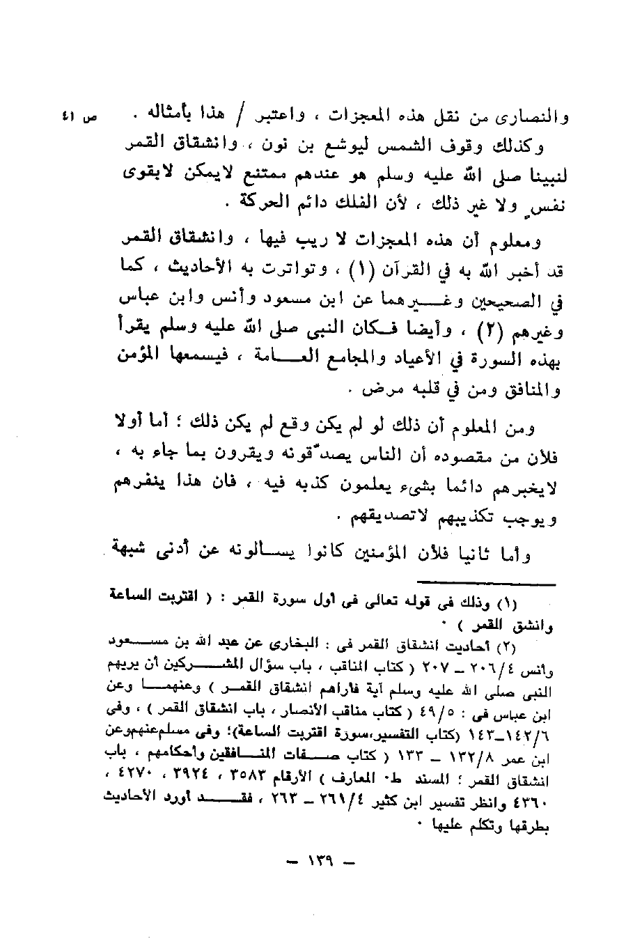 والنصارى من نقل هذه المعجزات واعتبر هذا بأمثاله وكذلك وقوف الشمس ليوشع بن نون وانشقاق القمر لنبينا صَلَّى اللَّهُ عَلَيْهِ وَسَلَّمَ هو عندهم ممتنع لا يمكن لا بقوى نفس ولا غير ذلك لأن الفلك دائم الحركة ومعلوم أن هذه المعجزات لا ريب فيها وانشقاق القمر قد أخبر الله به في القرآن وتواترت به الأحاديث كما في الصحيحين وغيرهما عن ابن مسعود وأنس وابن عباس وغيرهم وأيضا فكان النبي صَلَّى اللَّهُ عَلَيْهِ وَسَلَّمَ يقرأ بهذه السورة في الأعياد والمجامع العامة فيسمعها المؤمن والمنافق ومن في قلبه مرض ومن المعلوم أن ذلك لو لم يكن وقع لم يكن ذلك أما أولا فلأن من مقصوده أن الناس يصدقونه ويقرون بما جاء به لا يخبرهم دائما بشيء يعلمون كذبه فيه فإن هذا ينفرهم ويوجب تكذيبهم لا تصديقهم وأما ثانيا فلأن المؤمنين كانوا يسألونه عن أدنى شبهة