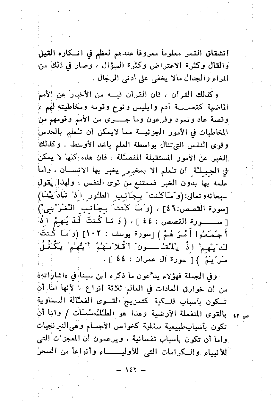وكذلك القرآن فإن القرآن فيه من الأخبار عن الأمم الماضية كقصة آدم وإبليس ونوح وقومه ومخاطبته لهم وقصة عاد وثمود وفرعون وما جرى من الأمم وقومهم من المخاطبات في الأمور الجزئية مما لا يمكن أن تعلم بالحدس وقوى النفس التي تنال بواسطة العلم بالحد الأوسط وكذلك الخبر عن الأمور المستقبلة المفصلة فإن هذه كلها لا يمكن في الجبلة أن تعلم إلا بمخبر يخبر بها الإنسان وأما علمه بها بدون الخبر فممتنع من قوى النفس ولهذا يقول سبحانه وتعالى {وَمَا كُنْتَ بِجَانِبِ الطُّورِ إِذْ نَادَيْنَا} {وَمَا كُنْتَ بِجَانِبِ الْغَرْبِي} {وَمَا كُنْتَ لَدَيْهِمْ إِذْ أَجْمَعُوا أَمْرَهُمْ} {وَمَا كُنْتَ لَدَيْهِمْ إِذْ يُلْقُونَ أَقْلامَهُمْ أَيُّهُمْ يَكْفُلُ مَرْيَمَ} وفي الجملة فهؤلاء يدعون ما ذكره ابن سينا في إشاراته من أن خوارق العادات في العالم ثلاثة أنواع لأنها إما أن تكون بأسباب فلكية كتمزيج القوى الفعالة السماوية بالقوى المنفعلة الأرضية وهذا هو الطلسمات وإما أن تكون بأسباب طبيعة سفلية كخواص الأجسام وهي النيرنجيات وإما أن تكون بأسباب نفسانية ويزعمون أن المعجزات التي للأنبياء والكرامات التي للأولياء وأنواعا من السحر