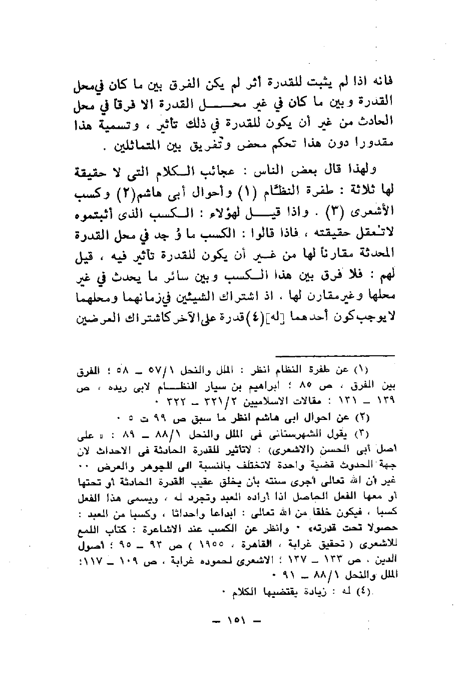 ولهذا قال بعض الناس عجائب الكلام التي لا حقيقة لها ثلاثة طفرة النظام وأحوال أبي هاشم وكسب الأشعري وإذا قيل لهؤلاء الكسب الذي أثبتموه لا تعقل حقيقته فإذا قالوا الكسب ما وجد في محل القدرة المحدثة مقارنا لها من غير أن يكون للقدرة تأثير فيه قيل لهم فلا فرق بين هذا الكسب وبين سائر ما يحدث في غير محلها وغير مقارن لها إذ اشتراك الشيئين في زمانهما ومحلهما لا يوجب كون أحدهما له قدرة على الآخر كاشتراك العرضين