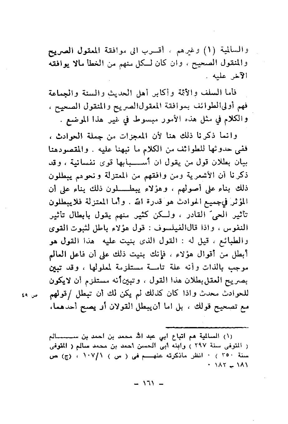 والسالمية وغيرهم أقرب إلى موافقة المعقول الصريح والمنقول الصحيح وإن كان لكل منهم من الخطأ ما لا يوافقه الآخر عليه فأما السلف والأئمة وأكابر أهل الحديث والسنة والجماعة فهم أولى الطوائف بموافقة المعقول الصحيح والمنقول والصحيح والكلام في مثل هذه الأمور مبسوط في غير هذا الموضع وإنما ذكرنا ذلك هنا لأن المعجزات من جملة الحوادث ففي حدوثها للطوائف من الكلام ما نبهنا عليه