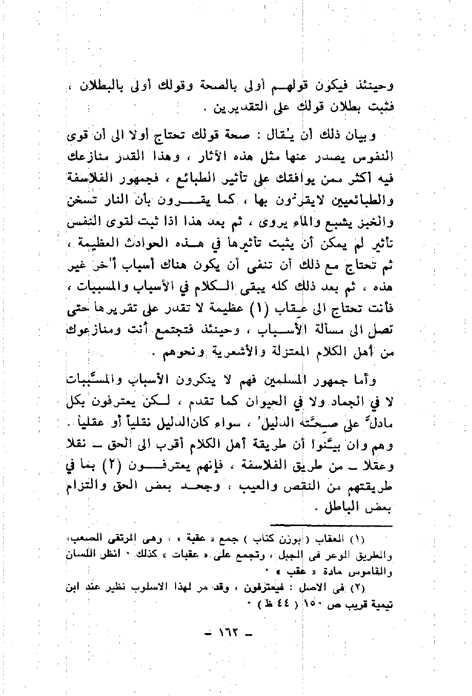 وأما جمهور المسلمين فهم لا ينكرون الأسباب والمسببات لا في الجماد ولا في الحيوان كما تقدم لكن يعترفون بكل ما دل على صحته الدليل سواء كان الدليل نقليا أو عقليا وهم وإن بينا أن طريقة أهل الكلام أقرب إلى الحق نقلا وعقلا من طريق الفلاسفة فإنهم يعترفون بما في طريقتهم من النقص والعيب وجحد بعض الحق والتزام بعض الباطل.