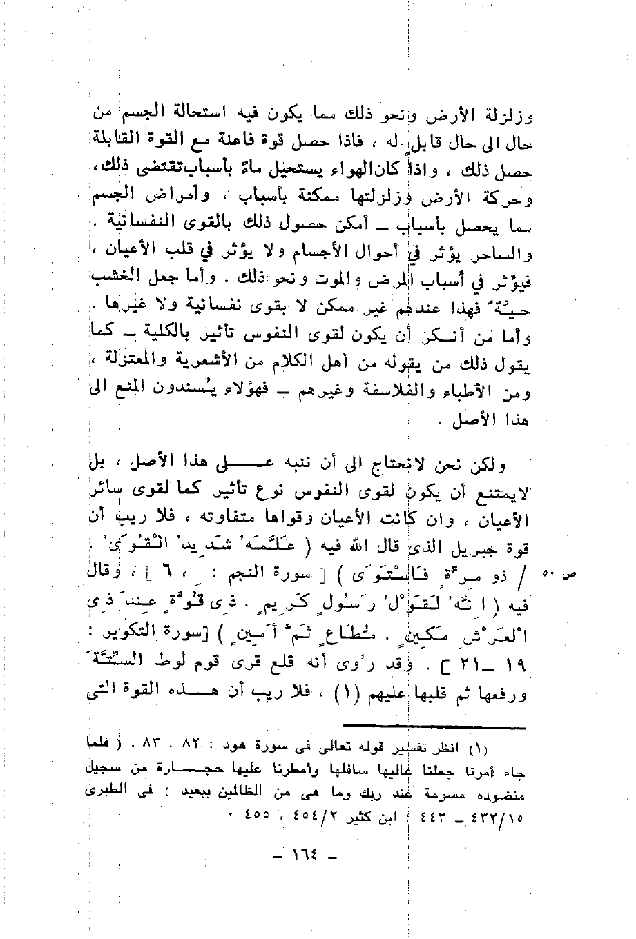 ولكن نحن لا نحتاج إلى ان ننبه على هذا الأصل بل لا يمتنع أن يكون لقوى النفوس نوع تأثير كما لقوى سائر الأعيان وإن كانت الأعيان وقواها متفاوتة فلا ريب أن قوة جبريل الذي قال الله فيه {عَلَّمَهُ شَدِيدُ الْقُوَى ذُو مِرَّةٍ فَاسْتَوَى} وقال فيه {إِنَّهُ لَقَوْلُ رَسُولٍ كَرِيمٍ ذِي قُوَّةٍ عِنْدَ ذِي الْعَرْشِ مَكِينٍ مُطَاعٍ ثَمَّ أَمِينٍ} وقد روى أنه قلع قرى قوم لوط الستة ورفعها ثم قلبها عليها فلا ريب أن هذه القوة التي