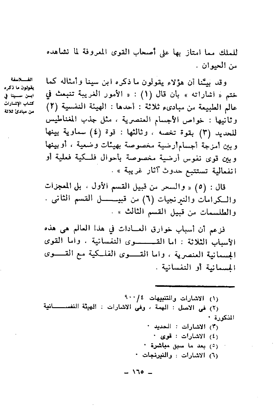 وقد بينا أن هؤلاء يقولون ما ذكره ابن سينا وأمثاله كما ختم إشاراته بأن قال الأمور الغريبة تنبعث في عالم الطبيعة من مبادىء ثلاثة أحدها الهيئة النفسية وثانيها خواص الأجسام العنصرية مثل جذب المغناطيس للحديد بقوة تخصه وثالثها قوة سماوية بينها وبين أمزجة أجسام أرضية مخصوصة بهيئات وضعية أو بينها وبين قوى نفوس أرضية مخصوصة بأحوال فلكية فعلية أو انفعالية تستتبع حدوث آثار غريبة.