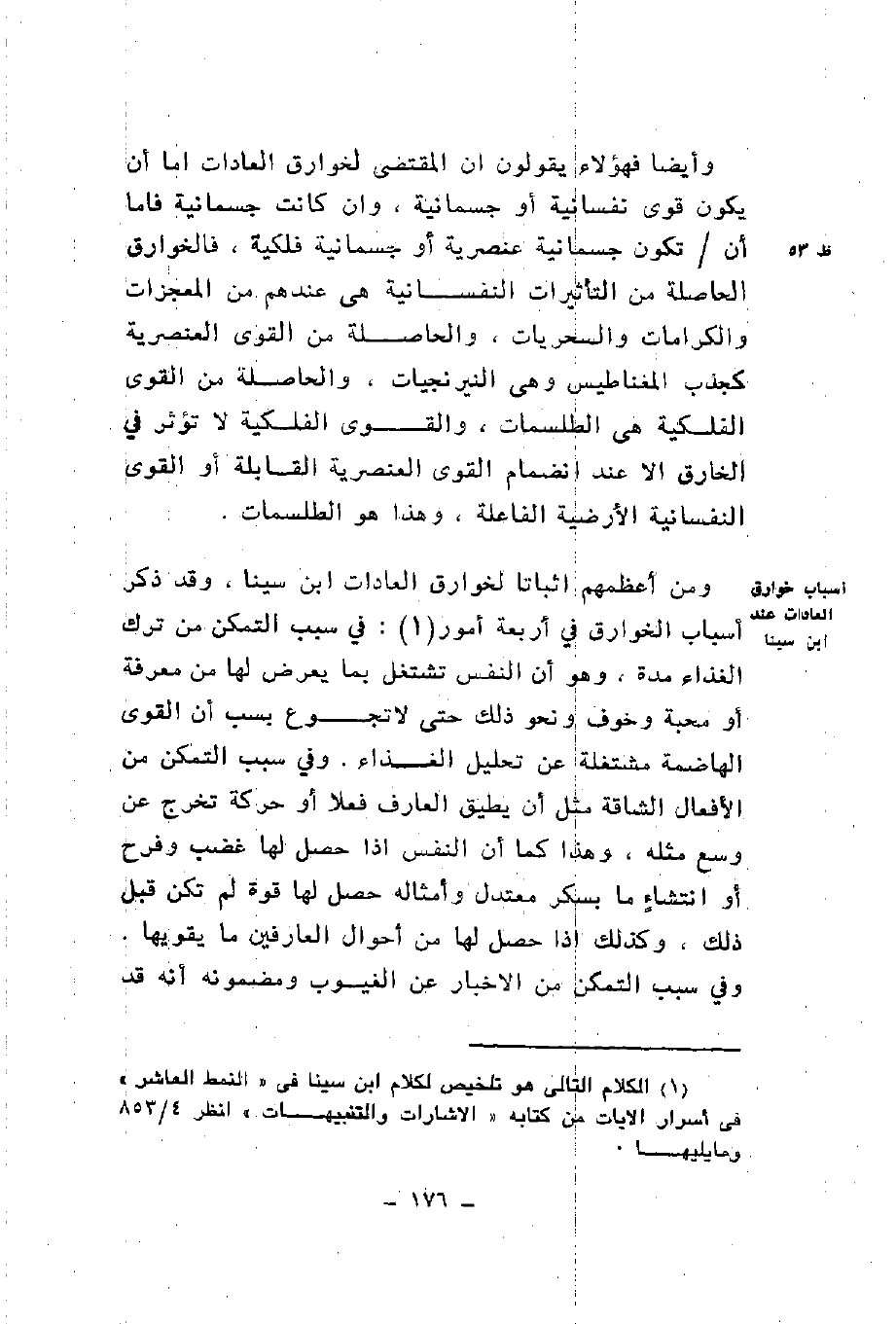 ومن أعظمهم إثباتا لخوارق العادات ابن سينا وقد ذكر أسباب الخوارق في أربعة أمور في سبب التمكن من ترك الغذاء مدة وهو أن النفس تشتغل بما يعرض لها من معرفة أو محبة وخوف ونحو ذلك حتى لا تجوع بسب أن القوى الهاضمة مشتغلة عن تحليل الغذاء وفي سبب التمكن من الأفعال الشاقة مثل أن يطيق العارف فعلا أو حركة تخرج عن وسع مثله وهذا كما أن النفس إذا حصل لها غضب وفرح أو انتشاء ما بسكر معتدل وأمثاله حصل لها قوة لم تكن قبل ذلك وكذلك إذا حصل لها من أحوال العارفين ما يقويها وفي سبب التمكن من الإخبار عن الغيوب ومضمونه أنه قد