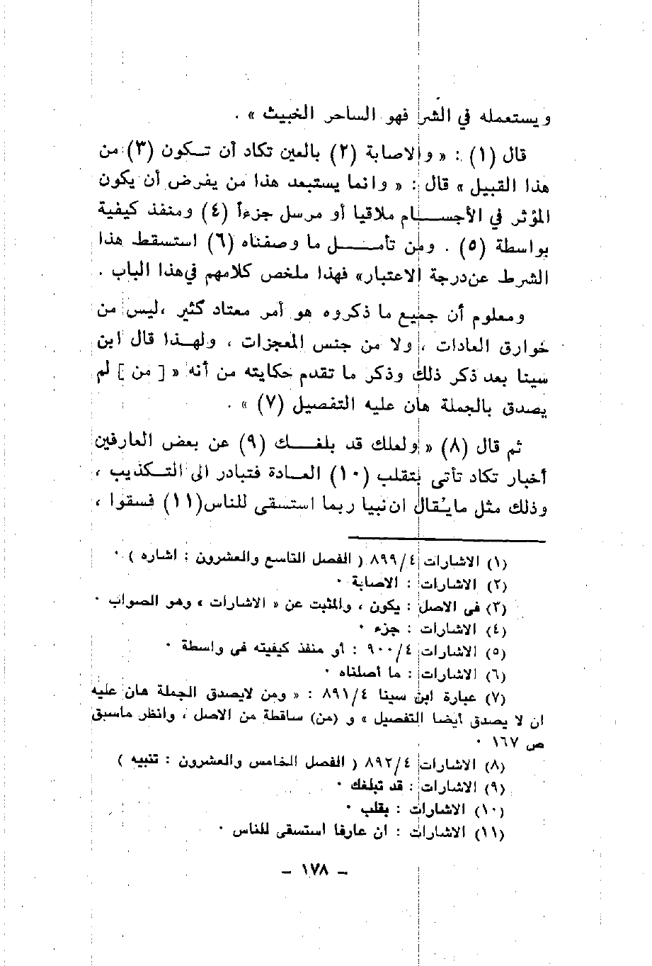 قال: والإصابة بالعين تكاد أن تكون من هذا القبيل, قال: وإنما يستبعد هذا من يفرض أن يكون المؤثر في الأجسام ملاقيا أو مرسل جزءا ومنفذ كيفية بواسطة ومن تأمل ما وصفناه استسقط هذا الشرط عن درجة الاعتبار فهذا ملخص كلامهم في هذا الباب ومعلوم أن جميع ما ذكروه هو أمر معتاد كثير ليس من خوارق العادات ولا من جنس المعجزات ولهذا قال ابن سينا بعد ذكر ذلك وذكر ما تقدم حكايته من أنه من لم يصدق بالجملة هان عليه التفصيل ثم قال ولعلك قد بلغك عن بعض العارفين أخبار تكاد تأتي بتقلب العادة فتبادر إلى التكذيب وذلك مثل ما يقال أن نبيا ربما استسقى للناس فسقوا