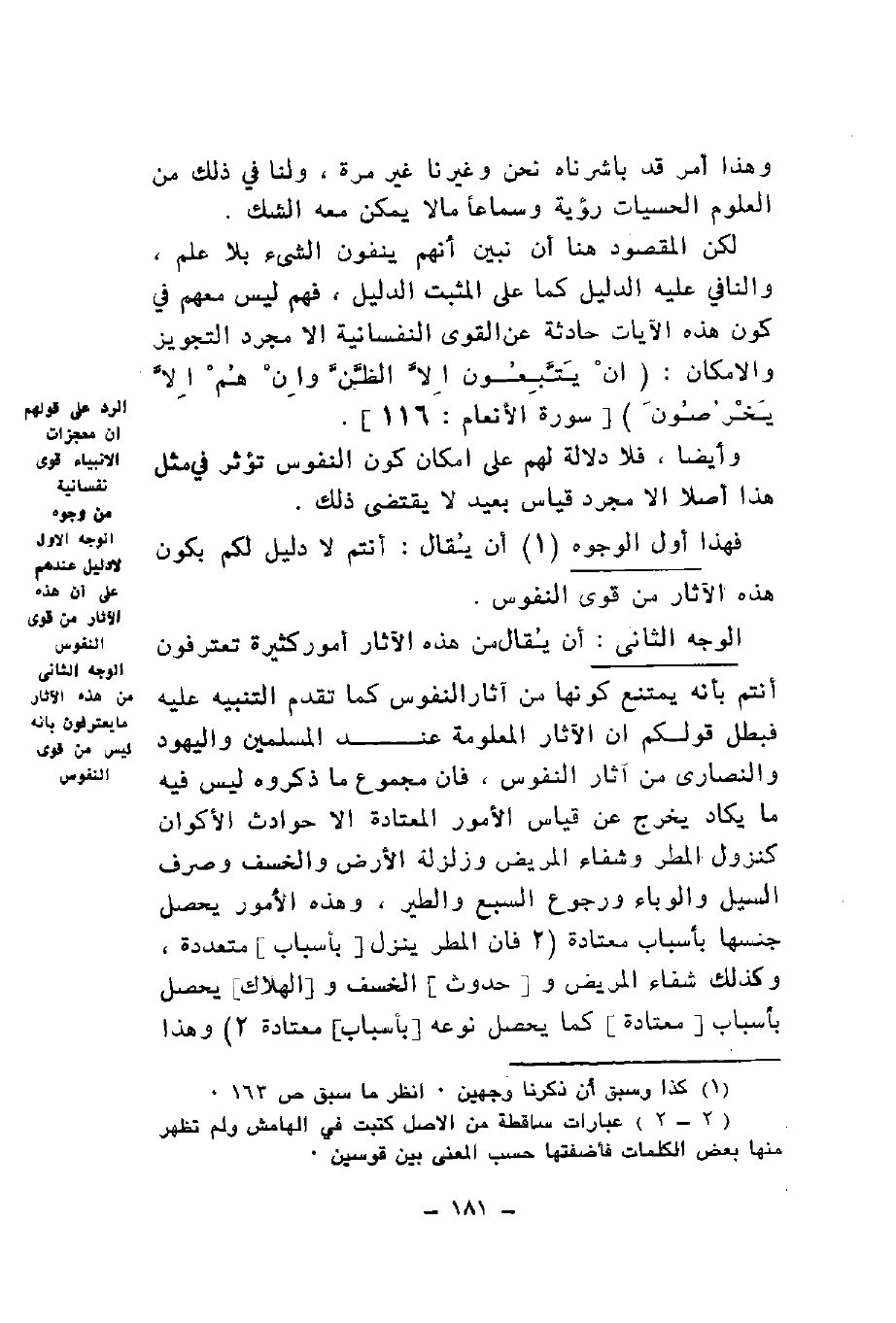 وهذا أمر قد باشرناه نحن وغيرنا غير مرة ولنا في ذلك من العلوم الحسيات رؤية وسماعا ما لا يمكن معه الشك لكن المقصود هنا أن نبين أنهم ينفون الشيء بلا علم والنافي عليه الدليل كما على المثبت الدليل فهم ليس معهم في كون هذه الآيات حادثة عن القوى النفسانية إلا مجرد التجويز والإمكان {إِنْ يَتَّبِعُونَ إِلَّا الظَّنَّ وَإِنْ هُمْ إِلَّا يَخْرُصُونَ} وأيضا فلا دلالة لهم على إمكان كون النفوس تؤثر في مثل هذا أصلا إلا مجرد قياس بعيد لا يقتضي ذلك فهذا أول الوجوه أن يقال أنتم لا دليل لكم بكون هذه الآثار من قوى النفوس