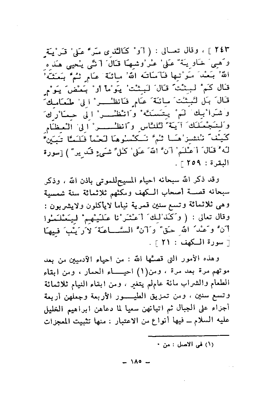 وقال تعالى {أَوْ كَالَّذِي مَرَّ عَلَى قَرْيَةٍ وَهِيَ خَاوِيَةٌ عَلَى عُرُوشِهَا قَالَ أَنَّى يُحْيِي هَذِهِ اللَّهُ بَعْدَ مَوْتِهَا فَأَمَاتَهُ اللَّهُ مِائَةَ عَامٍ ثُمَّ بَعَثَهُ قَالَ كَمْ لَبِثْتَ قَالَ لَبِثْتُ يَوْماً أَوْ بَعْضَ يَوْمٍ قَالَ بَلْ لَبِثْتَ مِائَةَ عَامٍ فَانْظُرْ إِلَى طَعَامِكَ وَشَرَابِكَ لَمْ يَتَسَنَّهْ وَانْظُرْ إِلَى حِمَارِكَ وَلِنَجْعَلَكَ آيَةً لِلنَّاسِ وَانْظُرْ إِلَى الْعِظَامِ كَيْفَ نُنْشِزُهَا ثُمَّ نَكْسُوهَا لَحْماً فَلَمَّا تَبَيَّنَ لَهُ قَالَ أَعْلَمُ أَنَّ اللَّهَ عَلَى كُلِّ شَيْءٍ قَدِيرٌ} وقد ذكر الله سبحانه إحياء المسيح للموتى بإذن الله وذكر سبحانه قصة أصحاب الكهف ومكثهم ثلاثمائة سنة شمسية وهي ثلاثمائة وتسع سنين قمرية نياما لا يأكلون ولا يشربون وقال تعالى {وَكَذَلِكَ أَعْثَرْنَا عَلَيْهِمْ لِيَعْلَمُوا أَنَّ وَعْدَ اللَّهِ حَقٌّ وَأَنَّ السَّاعَةَ لا رَيْبَ فِيهَا} وهذه الأمور التي قصها الله من أحياء الآدميين من بعد موتهم مرة بعد مرة ومن إحياء الحمار ومن إبقاء الطعام والشراب مائة عام لم يتغير ومن إبقاء النيام ثلاثمائة وتسع سنين ومن تمزيق الطيور الأربعة وجعلهن أربعة أجزاء على الجبال ثم أتيانهن سعيا لما دعاهن إبراهيم الخليل عليه السلام فيها أنواع من الاعتبار منها تثبيت المعجزات