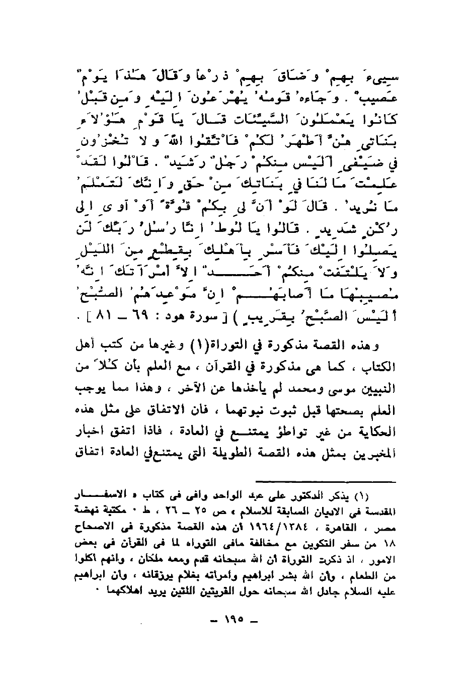 سِيءَ بِهِمْ وَضَاقَ بِهِمْ ذَرْعاً وَقَالَ هَذَا يَوْمٌ عَصِيبٌ وَجَاءَهُ قَوْمُهُ يُهْرَعُونَ إِلَيْهِ وَمِنْ قَبْلُ كَانُوا يَعْمَلُونَ السَّيِّئَاتِ قَالَ يَا قَوْمِ هَؤُلاءِ بَنَاتِي هُنَّ أَطْهَرُ لَكُمْ فَاتَّقُوا اللَّهَ وَلا تُخْزُونِ فِي ضَيْفِي أَلَيْسَ مِنْكُمْ رَجُلٌ رَشِيدٌ قَالُوا لَقَدْ عَلِمْتَ مَا لَنَا فِي بَنَاتِكَ مِنْ حَقٍّ وَإِنَّكَ لَتَعْلَمُ مَا نُرِيدُ قَالَ لَوْ أَنَّ لِي بِكُمْ قُوَّةً أَوْ آوِي إِلَى رُكْنٍ شَدِيدٍ قَالُوا يَا لُوطُ إِنَّا رُسُلُ رَبِّكَ لَنْ يَصِلُوا إِلَيْكَ فَأَسْرِ بِأَهْلِكَ بِقِطْعٍ مِنَ اللَّيْلِ وَلا يَلْتَفِتْ مِنْكُمْ أَحَدٌ إِلَّا امْرَأَتَكَ إِنَّهُ مُصِيبُهَا مَا أَصَابَهُمْ إِنَّ مَوْعِدَهُمُ الصُّبْحُ أَلَيْسَ الصُّبْحُ بِقَرِيبٍ} وهذه القصة مذكورة في التوراة وغيرها من كتب أهل الكتاب كما هي مذكورة في القرآن مع العلم بأن كلا من النبيين موسى ومحمد لم يأخذها عن الآخر وهذا مما يوجب العلم بصحتها قبل ثبوت نبوتهما فإن الاتفاق على مثل هذه الحكاية من غير تواطؤ يمتنع في العادة فإذا اتفق إخبار المخبرين بمثل هذه القصة الطويلة التي يمتنع في العادة اتفاق