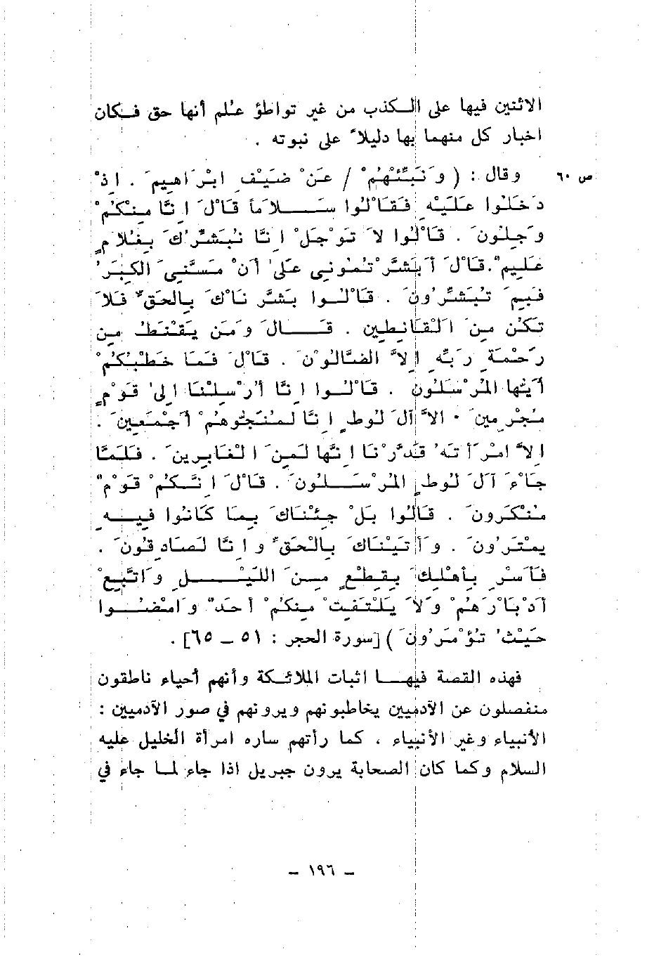 وقال {وَنَبِّئْهُمْ عَنْ ضَيْفِ إِبْرَاهِيمَ إِذْ دَخَلُوا عَلَيْهِ فَقَالُوا سَلاماً قَالَ إِنَّا مِنْكُمْ وَجِلُونَ قَالُوا لا تَوْجَلْ إِنَّا نُبَشِّرُكَ بِغُلامٍ عَلِيمٍ قَالَ أَبَشَّرْتُمُونِي عَلَى أَنْ مَسَّنِيَ الْكِبَرُ فَبِمَ تُبَشِّرُونَ قَالُوا بَشَّرْنَاكَ بِالْحَقِّ فَلا تَكُنْ مِنَ الْقَانِطِينَ قَالَ وَمَنْ يَقْنَطُ مِنْ رَحْمَةِ رَبِّهِ إِلَّا الضَّالُّونَ قَالَ فَمَا خَطْبُكُمْ أَيُّهَا الْمُرْسَلُونَ قَالُوا إِنَّا أُرْسِلْنَا إِلَى قَوْمٍ مُجْرِمِينَ إِلَّا آلَ لُوطٍ إِنَّا لَمُنَجُّوهُمْ أَجْمَعِينَ إِلَّا امْرَأَتَهُ قَدَّرْنَا إِنَّهَا لَمِنَ الْغَابِرِينَ فَلَمَّا جَاءَ آلَ لُوطٍ الْمُرْسَلُونَ قَالَ إِنَّكُمْ قَوْمٌ مُنْكَرُونَ قَالُوا بَلْ جِئْنَاكَ بِمَا كَانُوا فِيهِ يَمْتَرُونَ وَأَتَيْنَاكَ بِالْحَقِّ وَإِنَّا لَصَادِقُونَ فَأَسْرِ بِأَهْلِكَ بِقِطْعٍ مِنَ اللَّيْلِ وَاتَّبِعْ أَدْبَارَهُمْ وَلا يَلْتَفِتْ مِنْكُمْ أَحَدٌ وَامْضُوا حَيْثُ تُؤْمَرُونَ} فهذه القصة فيها إثبات الملائكة وأنهم أحياء ناطقون منفصلون عن الآدميين يخاطبونهم ويرونهم في صور الآدميين الأنبياء وغير الأنبياء كما رأتهم سارة امرأة الخليل عليه السلام وكما كان الصحابة يرون جبريل إذا جاء لما جاء في
