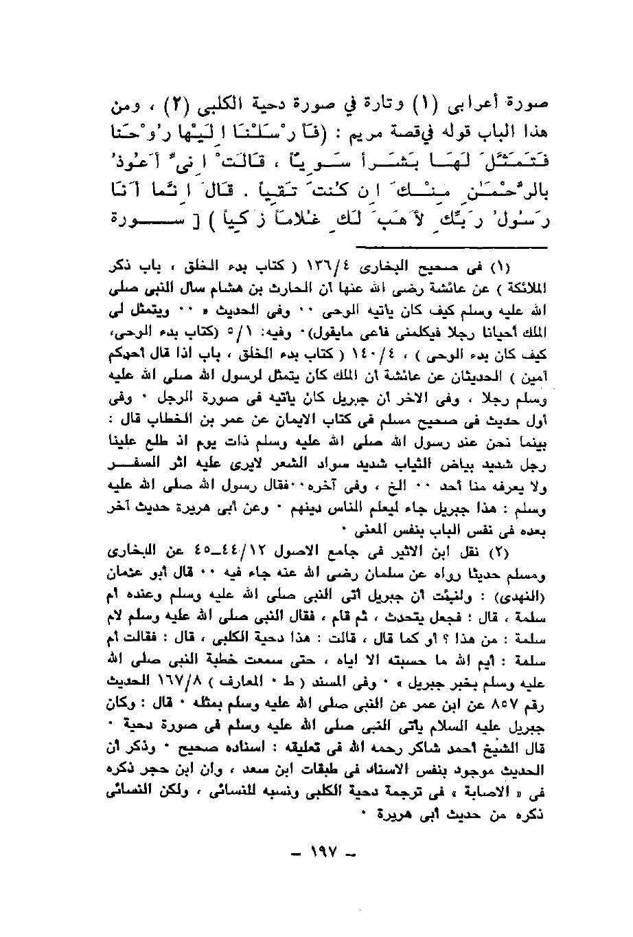 صورة أعرابي وتارة في صورة دحية الكلبي ومن هذا الباب قوله في قصة مريم {فَأَرْسَلْنَا إِلَيْهَا رُوحَنَا فَتَمَثَّلَ لَهَا بَشَراً سَوِيّاً قَالَتْ إِنِّي أَعُوذُ بِالرَّحْمَنِ مِنْكَ إِنْ كُنْتَ تَقِيّاً قَالَ إِنَّمَا أَنَا رَسُولُ رَبِّكِ لِأَهَبَ لَكِ غُلاماً زَكِيّاً}