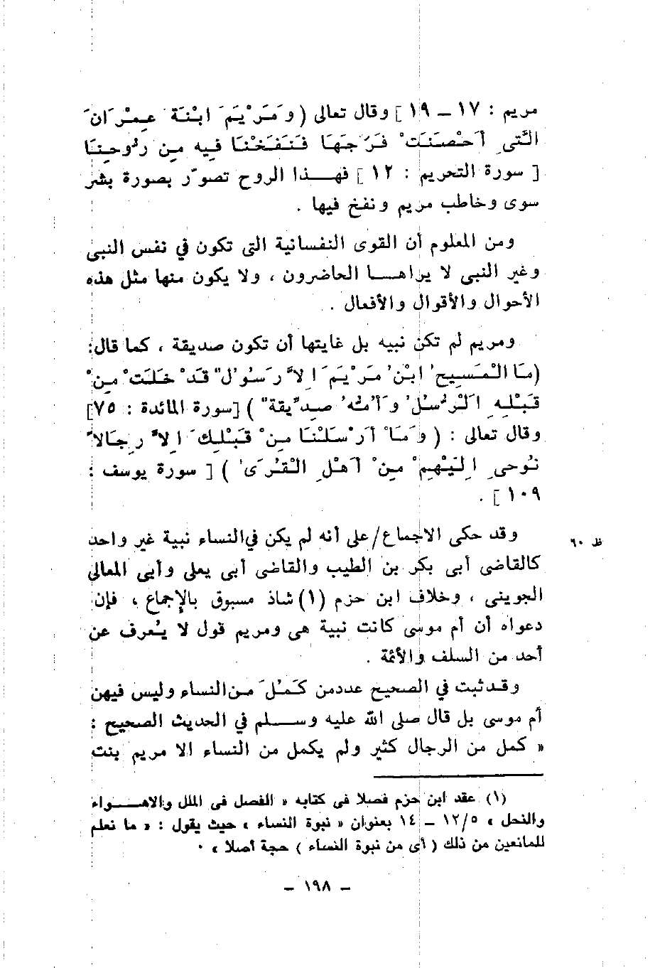 وقد حكى الإجماع على انه لم يكن في النساء نبية غير واحد كالقاضي أبي بكر بن الطيب والقاضي أبي يعلى وأبي المعالي الجويني وخلاف ابن حزم شاذ مسبوق بالإجماع فإن دعواه أن أم موسى كانت نبية هي ومريم قول لا يعرف عن أحد من السلف والأئمة وقد ثبت في الصحيح عدد من كمل من النساء وليس فيهن أم موسى بل قال صَلَّى اللَّهُ عَلَيْهِ وَسَلَّمَ في الحديث الصحيح: "كمل من الرجال كثير ولم يكمل من النساء إلا مريم بنت