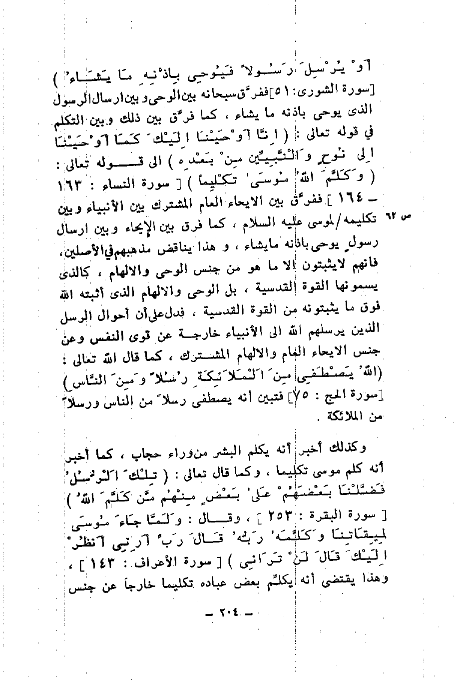 وكذلك أخبر أنه يكلم البشر من وراء حجاب كما أخبر أنه كلم موسى تكليما وكما قال تعالى {تِلْكَ الرُّسُلُ فَضَّلْنَا بَعْضَهُمْ عَلَى بَعْضٍ مِنْهُمْ مَنْ كَلَّمَ اللَّهُ} وقال {وَلَمَّا جَاءَ مُوسَى لِمِيقَاتِنَا وَكَلَّمَهُ رَبُّهُ قَالَ رَبِّ أَرِنِي أَنْظُرْ إِلَيْكَ قَالَ لَنْ تَرَانِي} وهذا يقتضي انه يكلم بعض عباده تكليما خارجا عن جنس