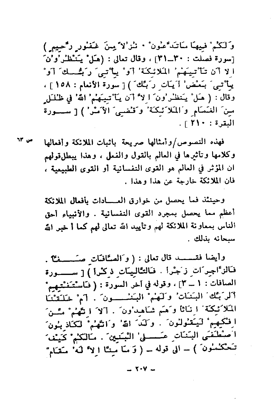 فهذه النصوص وأمثالها صريحة بإثبات الملائكة وأفعالها وكلامها وتأثيرها في العالم بالقول والفعل وهذا يبطل قولهم إن المؤثر في العالم هو القوى النفسانية أو القوى الطبيعية فإن الملائكة خارجة عن هذا وهذا وحينئذ فما يحصل من خوارق العادات بأفعال الملائكة أعظم مما يحصل بمجرد القوى النفسانية والأنبياء أحق الناس بمعاونة الملائكة لهم وتأييد الله تعالى لهم كما أخبر الله سبحانه بذلك وأيضا فقد قال تعالى {وَالصَّافَّاتِ صَفّاً فَالزَّاجِرَاتِ زَجْراً فَالتَّالِيَاتِ ذِكْراً} وقوله في آخر السورة {فَاسْتَفْتِهِمْ أَلِرَبِّكَ الْبَنَاتُ وَلَهُمُ الْبَنُونَ أَمْ خَلَقْنَا الْمَلائِكَةَ إِنَاثاً وَهُمْ شَاهِدُونَ أَلا إِنَّهُمْ مِنْ إِفْكِهِمْ لَيَقُولُونَ وَلَدَ اللَّهُ وَإِنَّهُمْ لَكَاذِبُونَ أَصْطَفَى الْبَنَاتِ عَلَى الْبَنِينَ مَا لَكُمْ كَيْفَ تَحْكُمُونَ} إلى قوله {وَمَا مِنَّا إِلَّا لَهُ مَقَامٌ