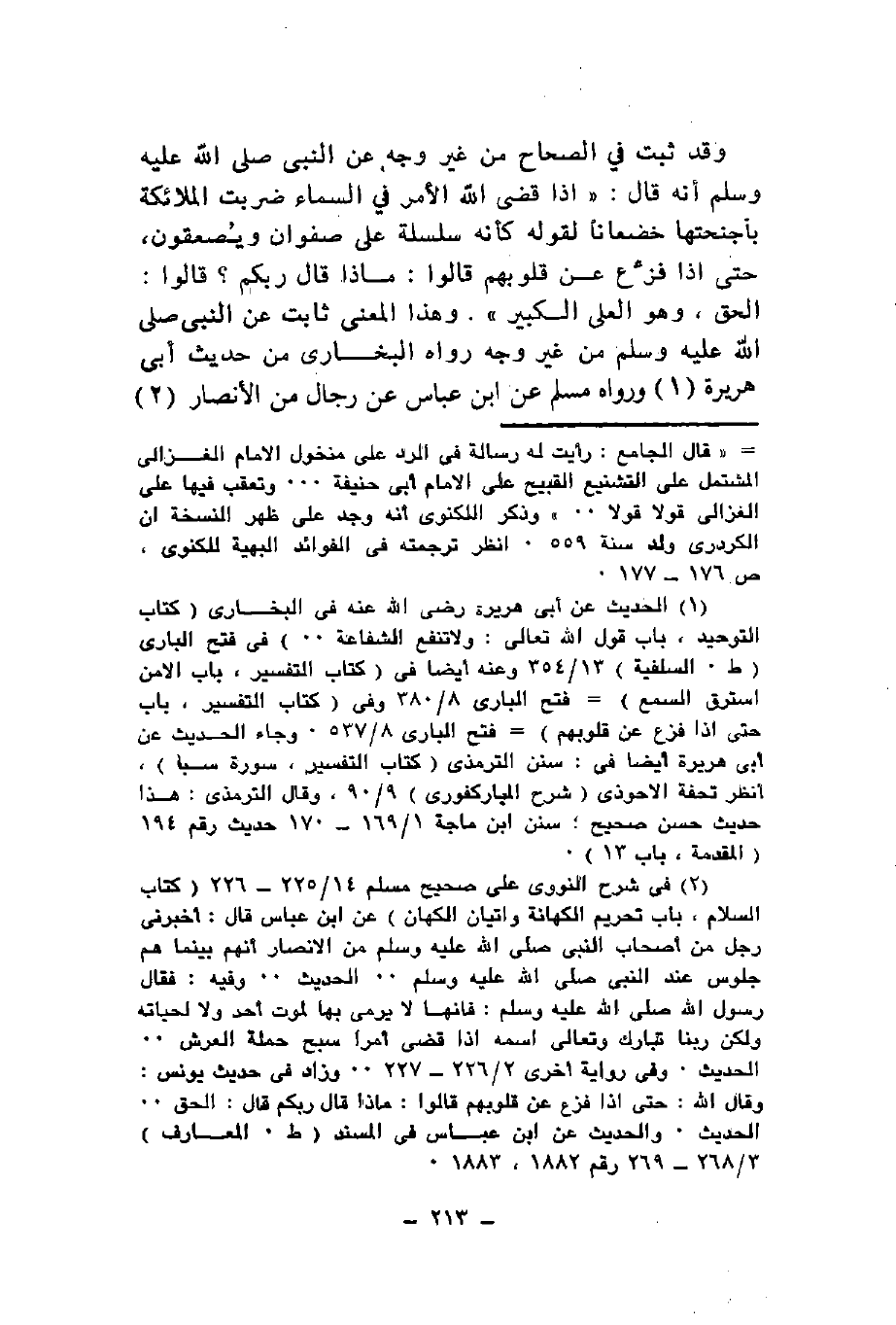 وقد ثبت في الصحاح من غير وجه عن النبي صَلَّى اللَّهُ عَلَيْهِ وَسَلَّمَ أنه قال: "إذا قضى الله الأمر في السماء ضربت الملائكة بأجنحتها خضعانا لقوله كأنه سلسلة على صفوان ويصعقون حتى إذا فزع عن قلوبهم قالوا ماذا قال ربكم قالوا الحق وهو العلي الكبير" وهذا المعنى ثابت عن النبي صَلَّى اللَّهُ عَلَيْهِ وَسَلَّمَ من غير وجه رواه البخاري من حديث أبي هريرة ورواه مسلم عن ابن عباس عن رجال من الأنصار