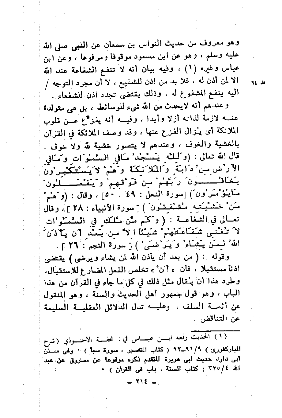 وهو معروف من حديث النواس بن سمعان عن النبي صَلَّى اللَّهُ عَلَيْهِ وَسَلَّمَ وهو عن ابن مسعود موقوفا ومرفوعا وعن ابن عباس وغيره وفيه بيان أنه لا تنفع الشفاعة عند الله إلا لمن أذن له فلا بد من إذن للشفيع لا أن مجرد التوجه إليه ينفع المشفوع له وذلك يقتضي تجدد إذن للشفعاء وعندهم أنه لا يحدث من الله شيء للوسائط بل هي متولدة عنه لازمة لذاته أزلا وأبدا وفيه أنه يفزع عن قلوب الملائكة أي يزال الفزع عنها وقد وصف الملائكة في القرآن بالخشية والخوف وعندهم لا يتصور خشية لله ولا خوف قال الله تعالى {وَلِلَّهِ يَسْجُدُ مَا فِي السَّمَاوَاتِ وَمَا فِي الْأَرْضِ مِنْ دَابَّةٍ وَالْمَلائِكَةُ وَهُمْ لا يَسْتَكْبِرُونَ يَخَافُونَ رَبَّهُمْ مِنْ فَوْقِهِمْ وَيَفْعَلُونَ مَا يُؤْمَرُونَ} وقال {وَهُمْ مِنْ خَشْيَتِهِ مُشْفِقُونَ} وقال تعالى في الشفاعة {وَكَمْ مِنْ مَلَكٍ فِي السَّمَاوَاتِ لا تُغْنِي شَفَاعَتُهُمْ شَيْئاً إِلا مِنْ بَعْدِ أَنْ يَأْذَنَ اللَّهُ لِمَنْ يَشَاءُ وَيَرْضَى}