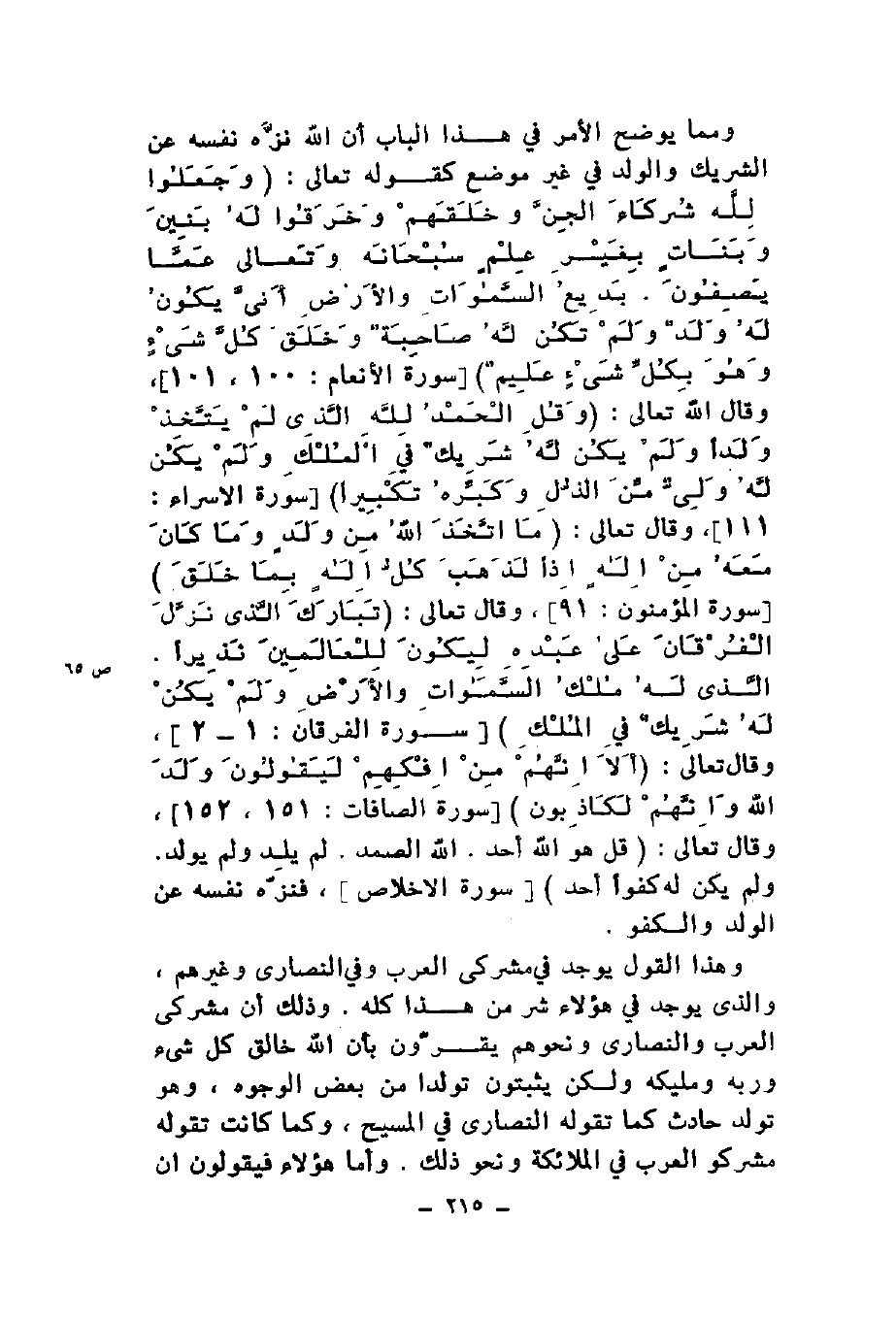 ومما يوضح الأمر في هذا الباب أن الله نزه نفسه عن الشريك والولد في غير موضع كقوله تعالى {وَجَعَلُوا لِلَّهِ شُرَكَاءَ الْجِنَّ وَخَلَقَهُمْ وَخَرَقُوا لَهُ بَنِينَ وَبَنَاتٍ بِغَيْرِ عِلْمٍ سُبْحَانَهُ وَتَعَالَى عَمَّا يَصِفُونَ بَدِيعُ السَّمَاوَاتِ وَالْأَرْضِ أَنَّى يَكُونُ لَهُ وَلَدٌ وَلَمْ تَكُنْ لَهُ صَاحِبَةٌ وَخَلَقَ كُلَّ شَيْءٍ وَهُوَ بِكُلِّ شَيْءٍ عَلِيمٌ} وقال الله تعالى {وَقُلِ الْحَمْدُ لِلَّهِ الَّذِي لَمْ يَتَّخِذْ وَلَداً وَلَمْ يَكُنْ لَهُ شَرِيكٌ فِي الْمُلْكِ وَلَمْ يَكُنْ لَهُ وَلِيٌّ مِنَ الذُّلِّ وَكَبِّرْهُ تَكْبِيراً} وقال تعالى {مَا اتَّخَذَ اللَّهُ مِنْ وَلَدٍ وَمَا كَانَ مَعَهُ مِنْ إِلَهٍ إِذاً لَذَهَبَ كُلُّ إِلَهٍ بِمَا خَلَقَ} (سورة المؤمنون 91) وقال تعالى {تَبَارَكَ الَّذِي نَزَّلَ الْفُرْقَانَ عَلَى عَبْدِهِ لِيَكُونَ لِلْعَالَمِينَ نَذِيراً الَّذِي لَهُ مُلْكُ السَّمَاوَاتِ وَالْأَرْضِ وَلَمْ يَتَّخِذْ وَلَداً وَلَمْ يَكُنْ لَهُ شَرِيكٌ فِي الْمُلْكِ} وقال تعالى {أَلا إِنَّهُمْ مِنْ إِفْكِهِمْ لَيَقُولُونَ وَلَدَ اللَّهُ وَإِنَّهُمْ لَكَاذِبُونَ} وقال تعالى {قُلْ هُوَ اللَّهُ أَحَدٌ اللَّهُ الصَّمَدُ لَمْ يَلِدْ وَلَمْ يُولَدْ وَلَمْ يَكُنْ لَهُ كُفُواً أَحَدٌ} فنزه نفسه عن الولد والكفو وهذا القول يوجد في مشركي العرب وفي النصارى وغيرهم والذي يوجد في هؤلاء شر من هذا كله وذلك أن مشركي العرب والنصارى ونحوهم يقرون بأن الله خالق كل شيء وربه ومليكه ولكن يثبتون تولدا من بعض الوجوه وهو تولد حادث كما تقوله النصارى في المسيح وكما كانت تقوله مشركو العرب في الملائكة ونحو ذلك وأما هؤلاء فيقولون إن
