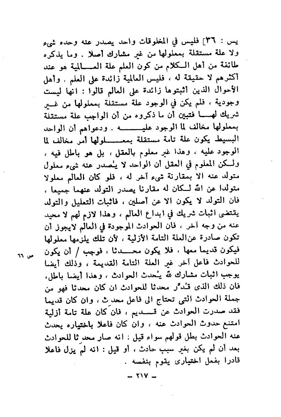 فليس في المخلوقات واحد يصدر عنه وحده شيء ولا علة مستقلة بمعلولها من غير مشارك أصلا وما يذكره طائفة من أهل الكلام من كون العلم علة العالمية هو عند أكثرهم لا حقيقة له فليس العالمية زائدة على العلم وأهل الأحوال الذين أثبتوها زائدة علىالعالم قالوا أنها ليست وجودية فلم يكن في الوجود علة مستقلة بمعلولها من غير شريك لها فتبين أن ما ذكروه من أن الواجب علة مستقلة بمعلولها مخالف لما الوجود عليه ودعواهم أن الواحد البسيط يكون علة تامة مستقلة بمعلولها أمر مخالف لما الوجود عليه وهذا غير معلوم بالعقل بل هو باطل فيه ولكن المعلوم في العقل أن الواحد لا يصدر عنه شيء معلول متولد عنه إلا بمقارنة شيء آخر له فلو كان العالم معلولا متولدا عن الله لكان له مقارنا يصدر التولد عنهما جميعا فإن التولد لا يكون إلا عن أصلين فإثبات التعليل والتولد يقتضي إثبات شريك في إبداع العالم وهذا لازم لهم لا محيد عنه من وجه آخر فإن الحوادث الموجودة في العالم لا يجوز أن تكون صادرة عن العلة التامة الأزلية لأن تلك يلزمها معلولها فيكون قديما معها فلا يكون محدثا فوجب أن يكون للحوادث فاعل آخر غير العلة التامة القديمة وذلك أيضا يوجب إثبات مشارك لله يحدث الحوادث وهذا أيضا باطل فإن ذلك الذي قدر محدثا للحوادث إن كان محدثا فهو من جملة الحوادث التي تحتاج إلى فاعل محدث وإن كان قديما فقد صدرت الحوادث عن قديم فإن كان علة تامة أزلية امتنع حدوث الحوادث عنه وإن كان فاعلا باختياره يحدث عنه الحوادث بطل قولهم سواء قيل أنه صار محدثا للحوادث بعد أن لم يكن بغير سبب حادث أو قيل أنه لم يزل فاعلا قادرا بفعل اختياري يقوم بنفسه.