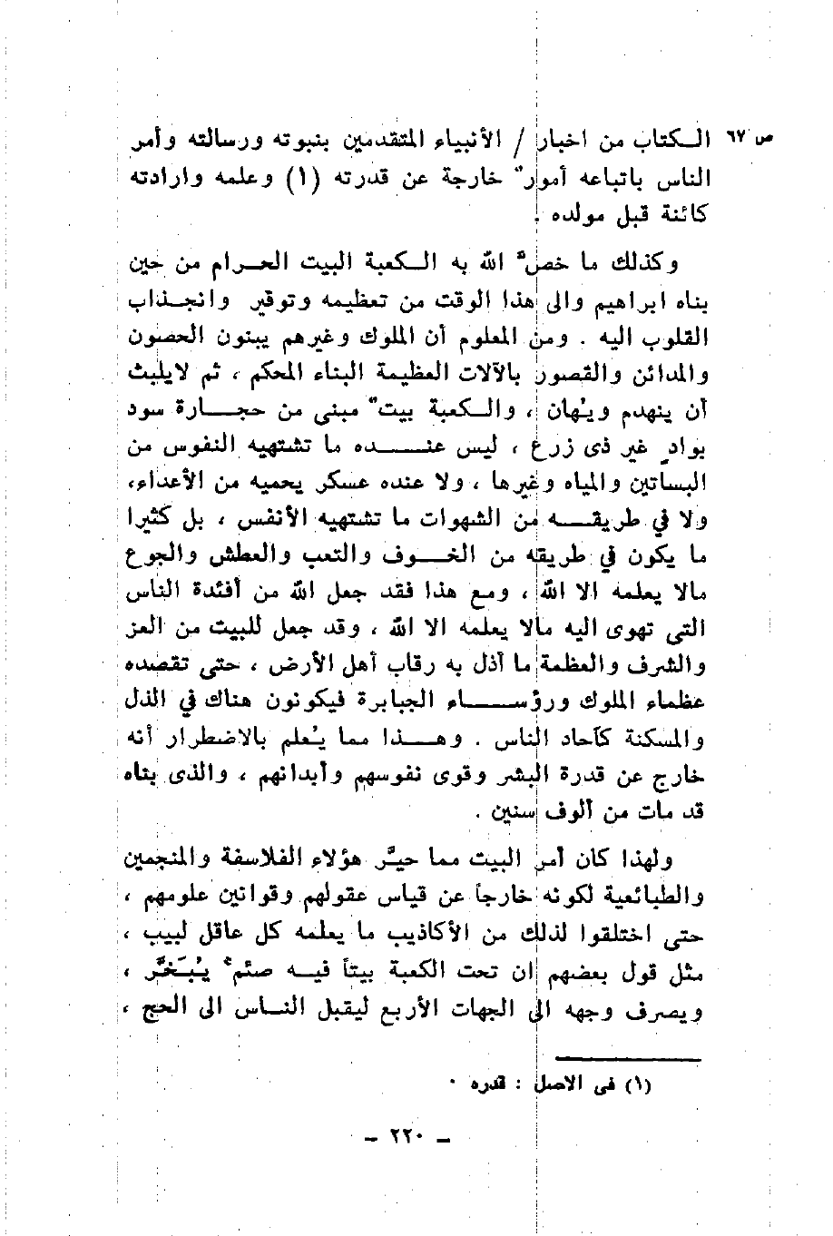 الكتاب من إخبار الأنبياء المتقدمين بنبوته ورسالته وأمر الناس باتباعه أمور خارجة عن قدرته وعلمه وإرادته كائنة قبل مولده وكذلك ما خص الله به الكعبة البيت الحرام من حين بناه إبراهيم وإلى هذا الوقت من تعظيمه وتوقير وانجذاب القلوب إليه ومن المعلوم أن الملوك وغيرهم يبنون الحصون والمدائن والقصور بالآلات العظيمة البناء المحكم ثم لا يلبث أن ينهدم ويهان والكعبة بيت مبني من حجارة سود بواد غير ذي زرع ليس عنده ما تشتهيه النفوس من البساتين والمياه وغيرها ولا عنده عسكر يحميه من الأعداء ولا في طريقه من الشهوات ما تشتهيه الأنفس بل كثيرا ما يكون في طريقه من الخوف والتعب والعطش والجوع ما لا يعلمه إلا الله ومع هذا فقد جعل الله من أفئدة الناس التي تهوى إليه ما لا يعلمه إلا الله وقد جعل للبيت من العز والشرف والعظمة ما أذل به رقاب أهل الأرض حتى تقصده عظماء الملوك ورؤساء الجبابرة فيكونون هناك في الذل والمسكنة كآحاد الناس وهذا مما يعلم بالاضطرار أنه خارج عن قدرة البشر وقوى نفوسهم وأبدانهم والذي بناه قد مات من ألوف سنين ولهذا كان أمر البيت مما حير هؤلاء الفلاسفة والمنجمين والطبائعية لكون خارجا عن قياس عقولهم وقوانين علومهم حتى اختلفوا لذلك من الأكاذيب ما يعلمه كل عاقل لبيب مثل قول بعضهم أن تحت الكعبة بيتا فيه صئم يبخر ويصرف وجهه إلى الجهات الأربع ليقبل الناس إلى الحج