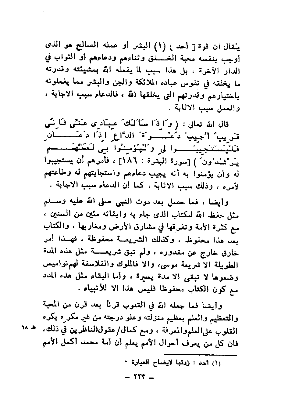 يقال أن قوة أحد البشر أو عمله الصالح هو الذي أوجب بنفسه محبة الخلق وثناءهم ودعاءهم أو الثواب في الدار الآخرة بل هذا سبب لما يفعله الله بمشيئته وقدرته ما يخلقه في نفوس عباده الملائكة والجن والبشر مما يفعلونه باختيارهم وقدرتهم التي يخلقها الله فالدعاء سبب الإجابة والعمل سبب الإثابة قال الله تعالى {وَإِذَا سَأَلَكَ عِبَادِي عَنِّي فَإِنِّي قَرِيبٌ أُجِيبُ دَعْوَةَ الدَّاعِ إِذَا دَعَانِ فَلْيَسْتَجِيبُوا لِي وَلْيُؤْمِنُوا بِي لَعَلَّهُمْ يَرْشُدُونَ} فأمرهم أن يستجيبوا له وأن يؤمنوا به أنه يجيب دعاءهم واستجابتهم له وطاعتهم لأمره وذلك سبب الإثابة كما أن الدعاء سبب الإجابة وأيضا فما حصل بعد موت النبي صَلَّى اللَّهُ عَلَيْهِ وَسَلَّمَ مثل حفظ الله للكتاب الذي جاء به وإبقائه مئين من السنين مع كثرة الأمة وتفرقها في مشارق الأرض ومغاربها والكتاب بعد هذا محفوظ وكذلك الشريعة محفوظة فهذا أمر خارق خارج عن مقدوره ولم تبق شريعة مثل هذه المدة الطويلة إلا شريعة موسى وإلا فالملوك والفلاسفة لهم نواميس وضعوها لا تبقى إلا مدة يسيرة وأما البقاء مثل هذه المدد مع كون الكتاب محفوظا فليس هذا إلا للأنبياء